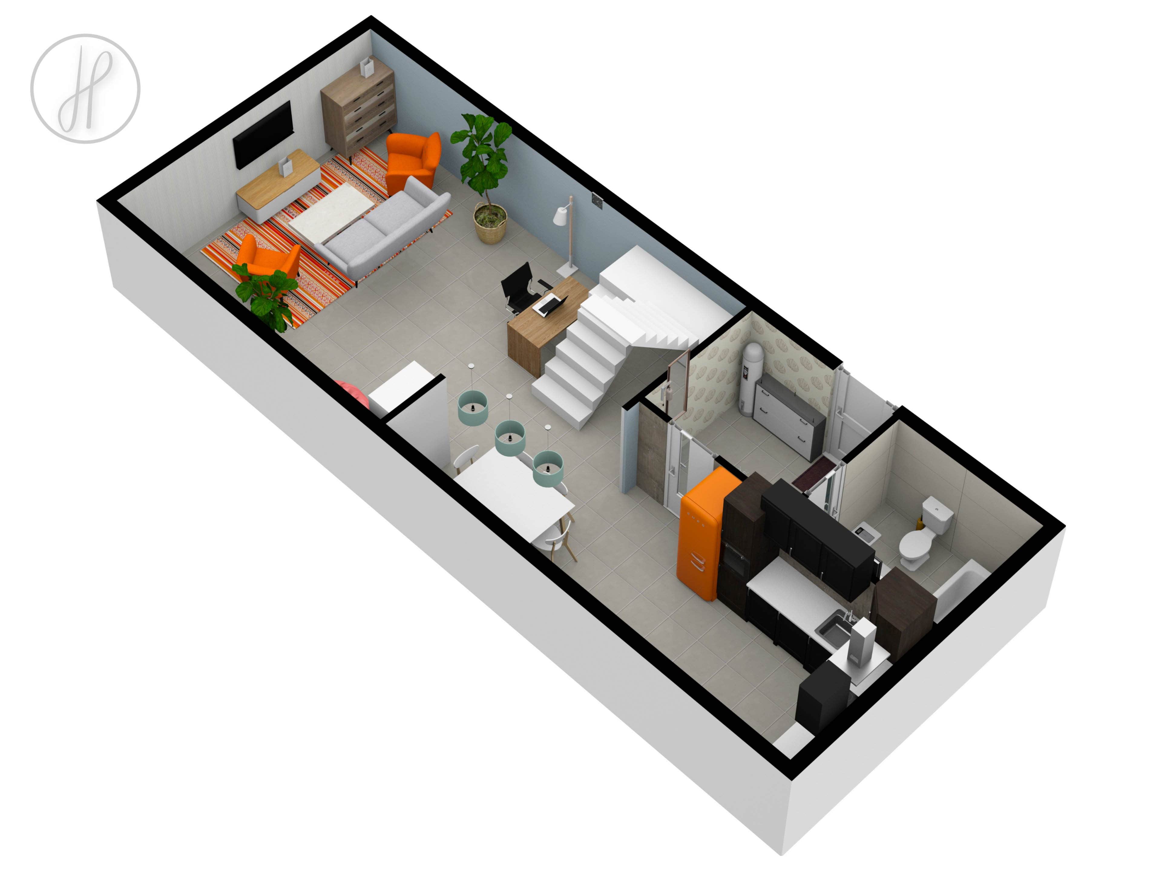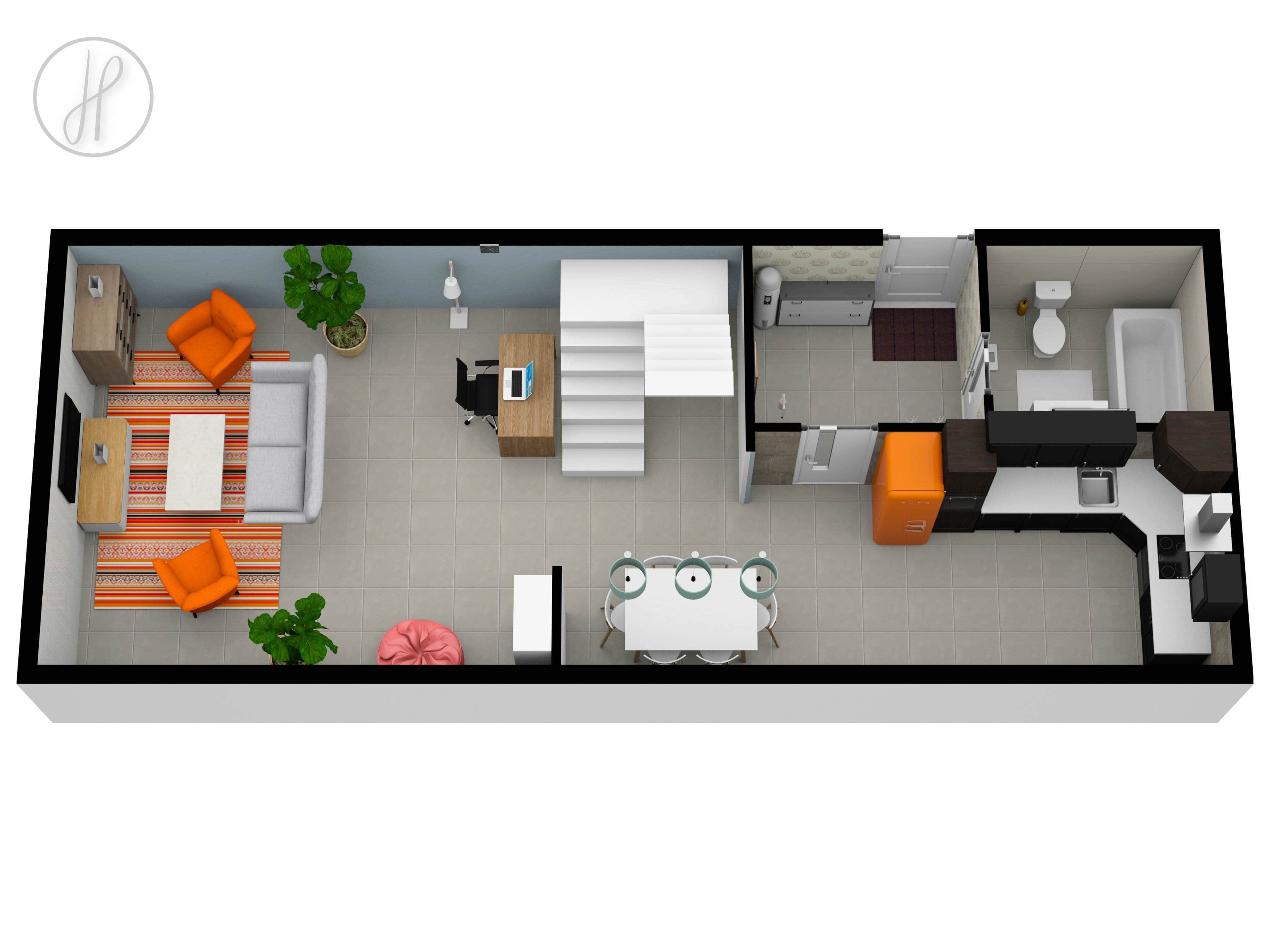 Byt se nachází v 5. nadzemním podlaží (4. patro) udržovaného historického domu s výtahem. Mezonetová dispozice citlivě odděluje společenskou a soukromou zónu bytu.