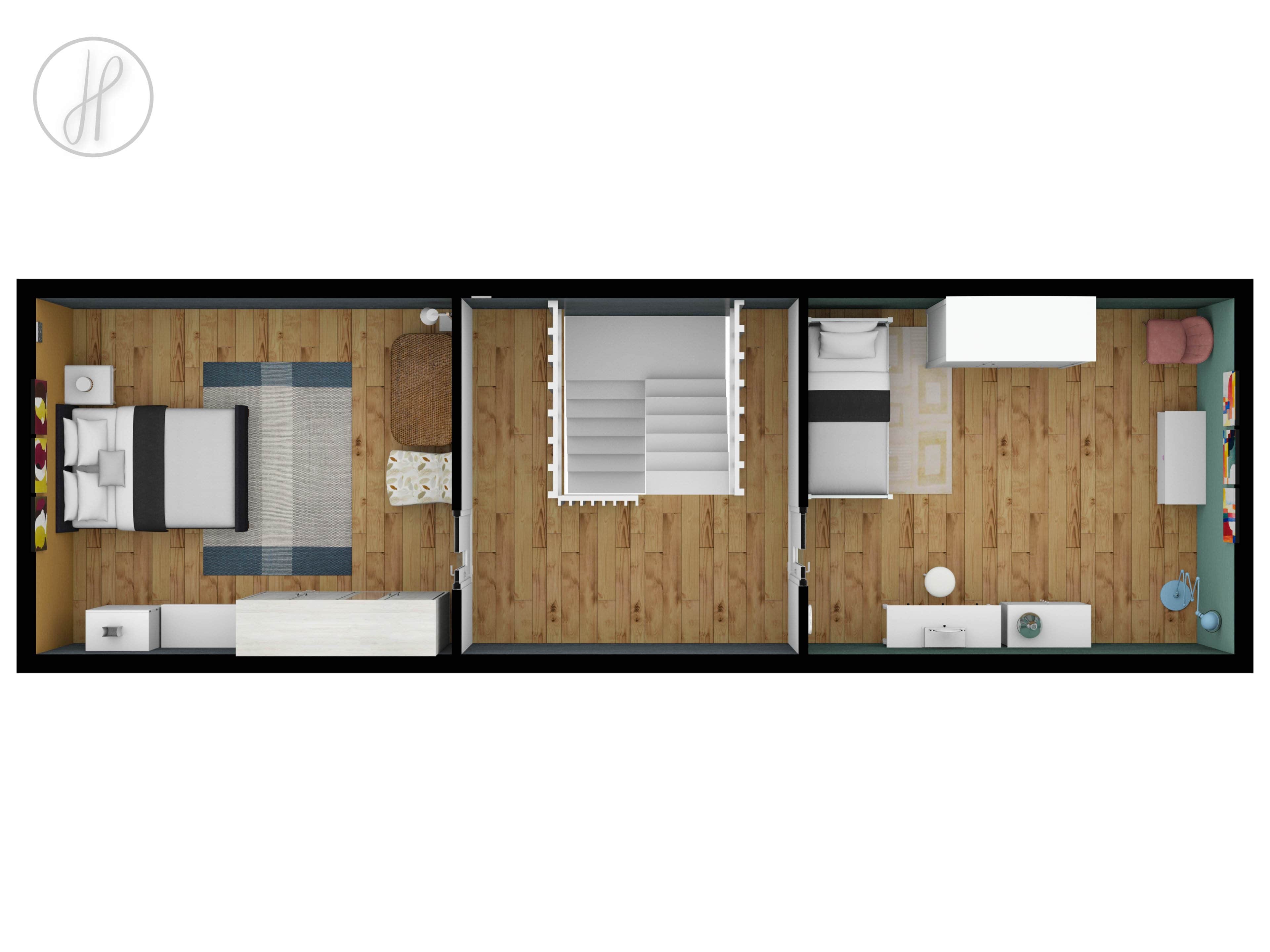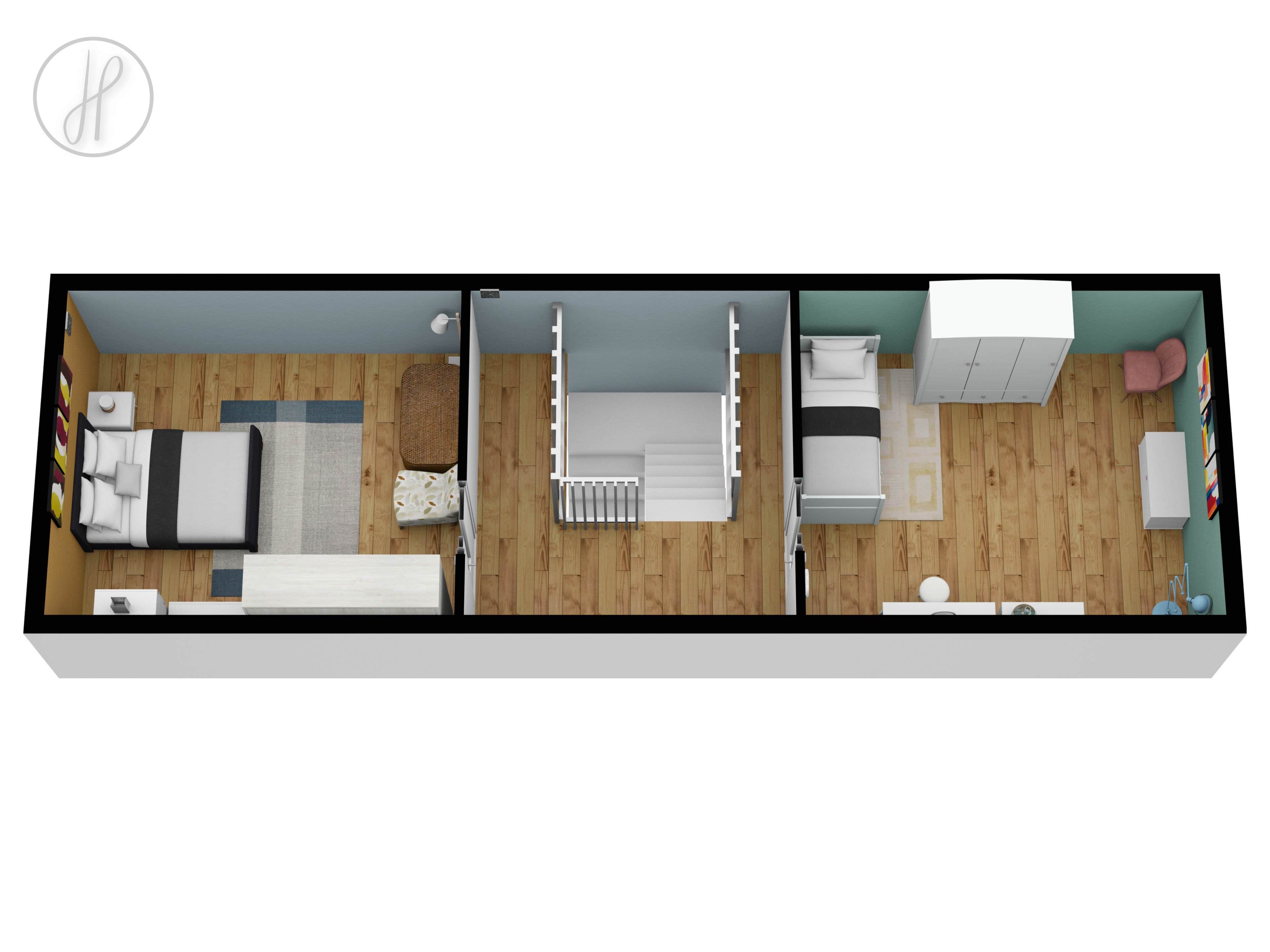 - Dva samostatné, neprůchozí pokoje s dřevěnými střešními vyklápěcími okny.