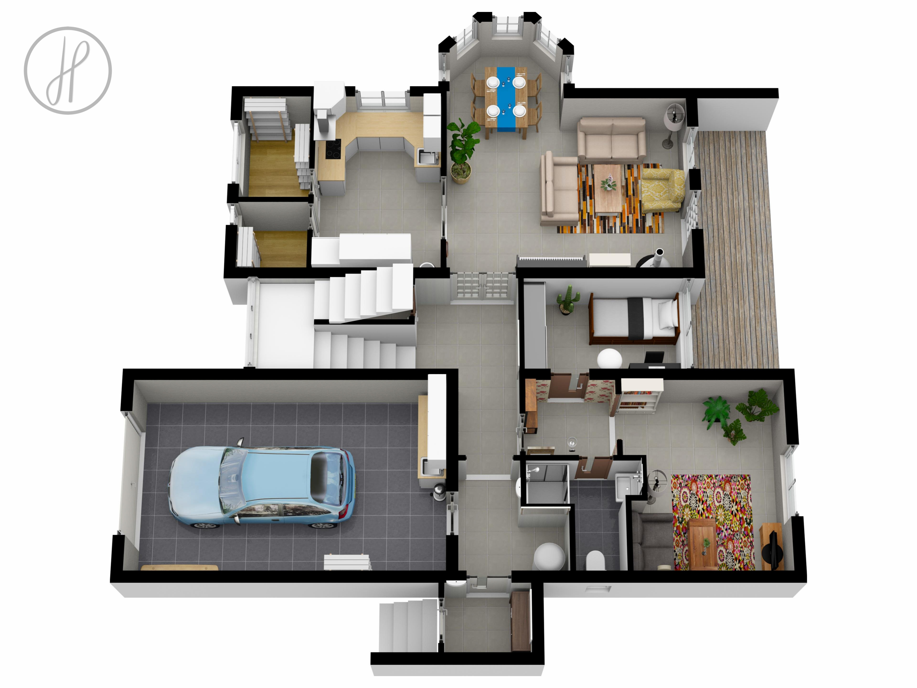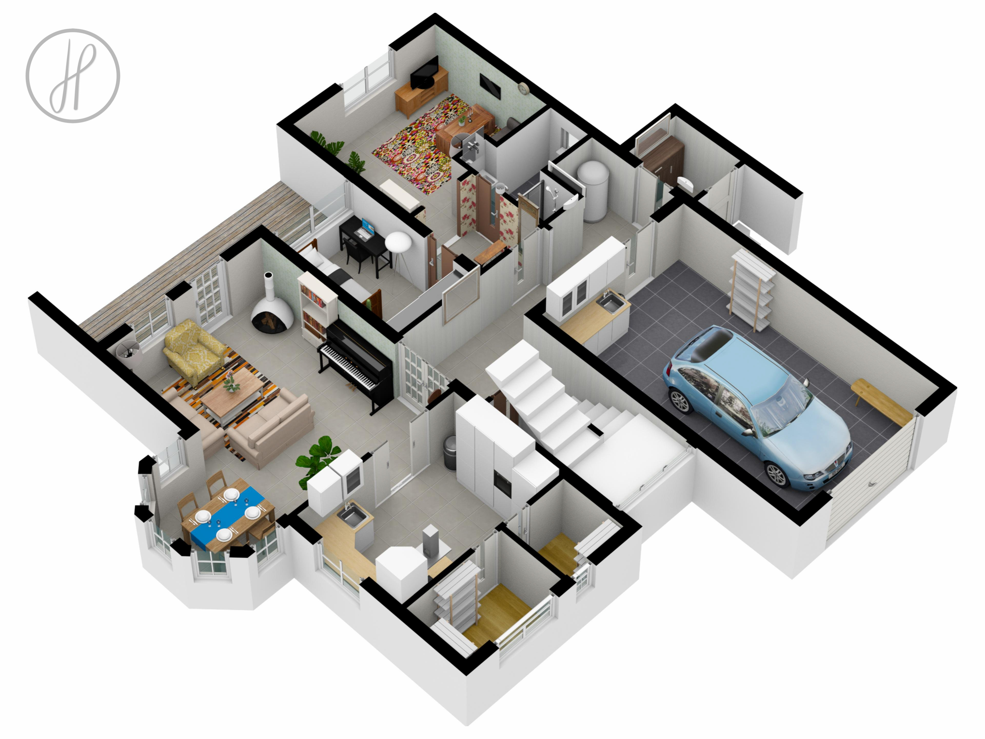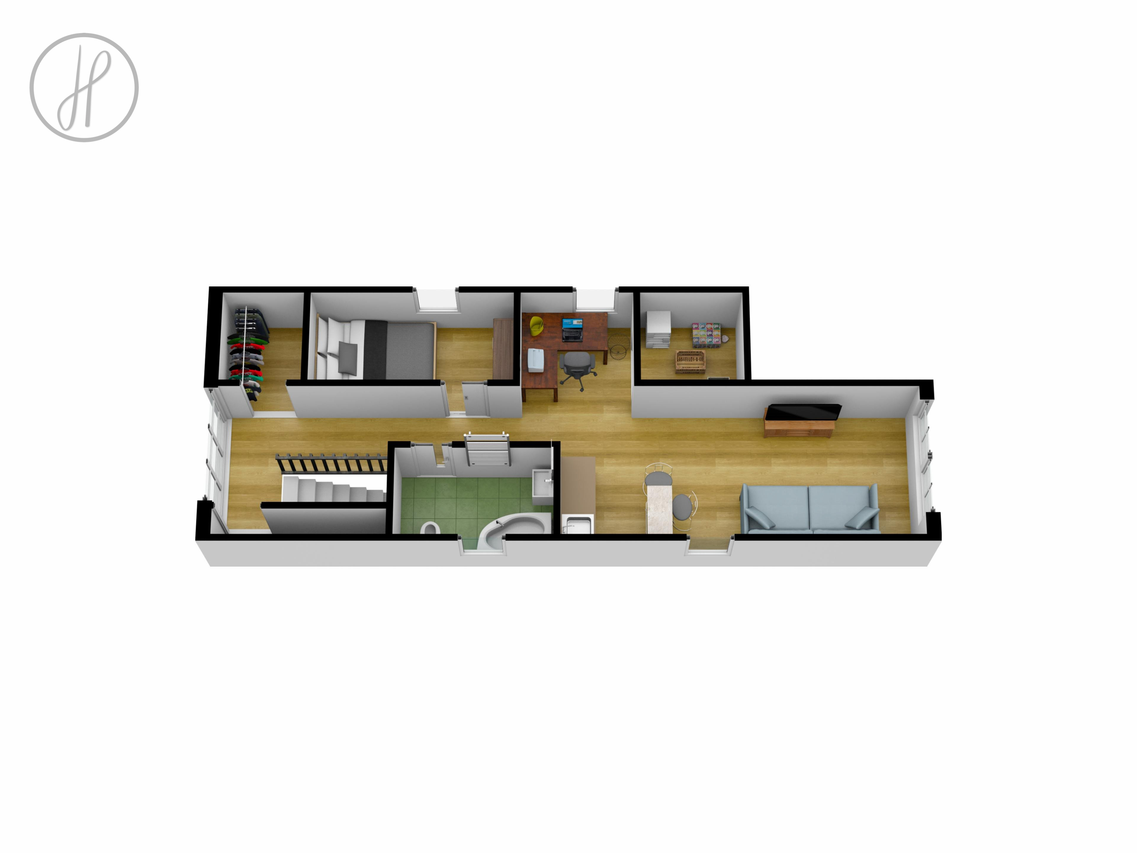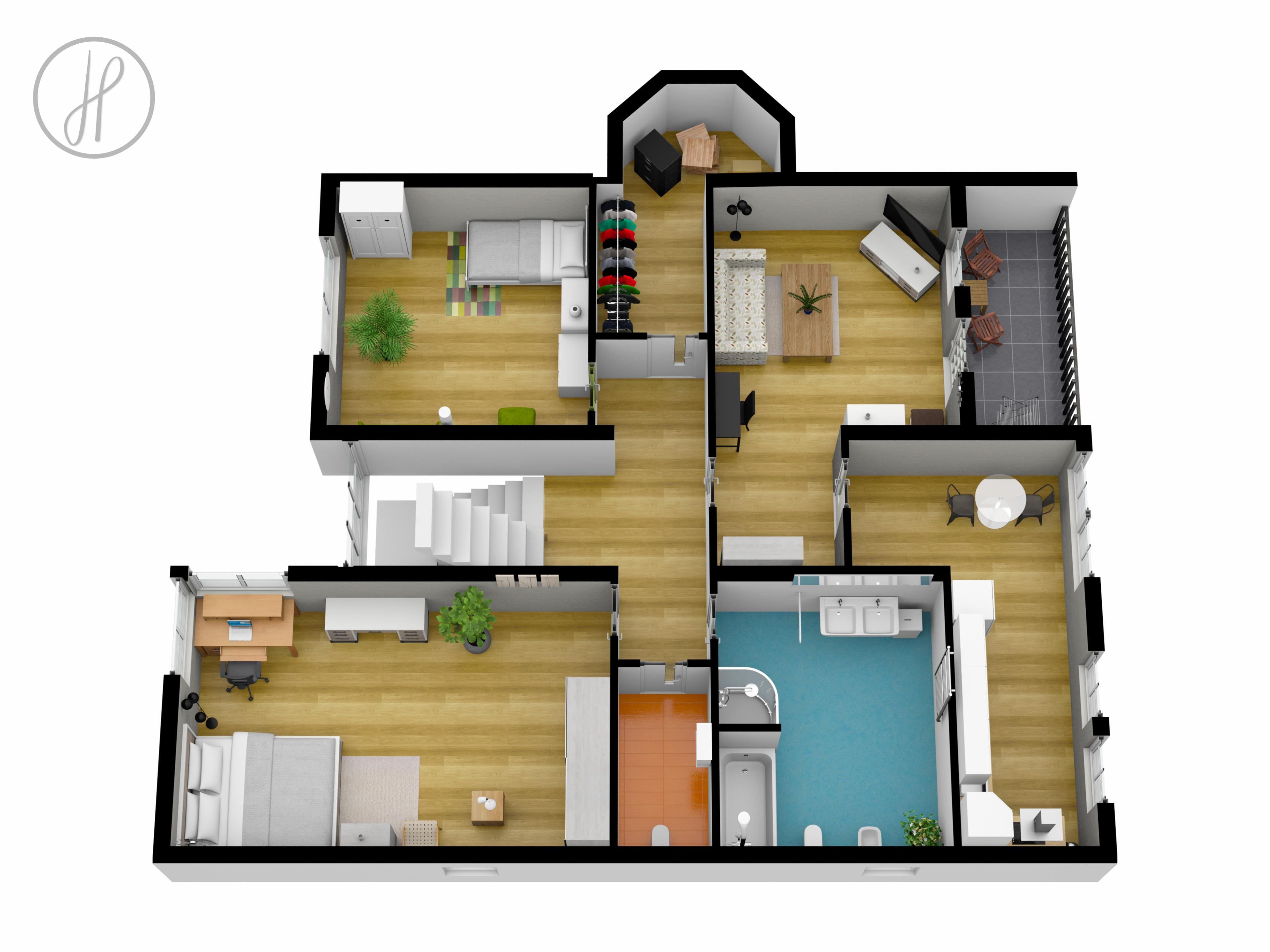 Dům je koncipován jako vícegenerační. Aktuálně je rozdělen na tři samostatné "bytové jednotky", z nichž každá disponuje vlastní obytnou částí a ložnicí. Celý objekt spojuje společná kuchyně a prostorný obývací pokoj s jídelnou, kterému dominuje krb na dřevo.