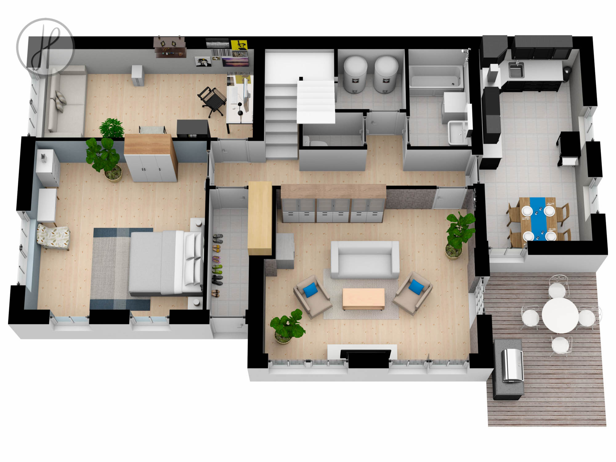 - 1. NP – obývací pokoj se vstupem na zahradu, kuchyně, ložnice, pracovna, samostatná toaleta, koupelna s vanou, technická místnost a předsíň s halou.