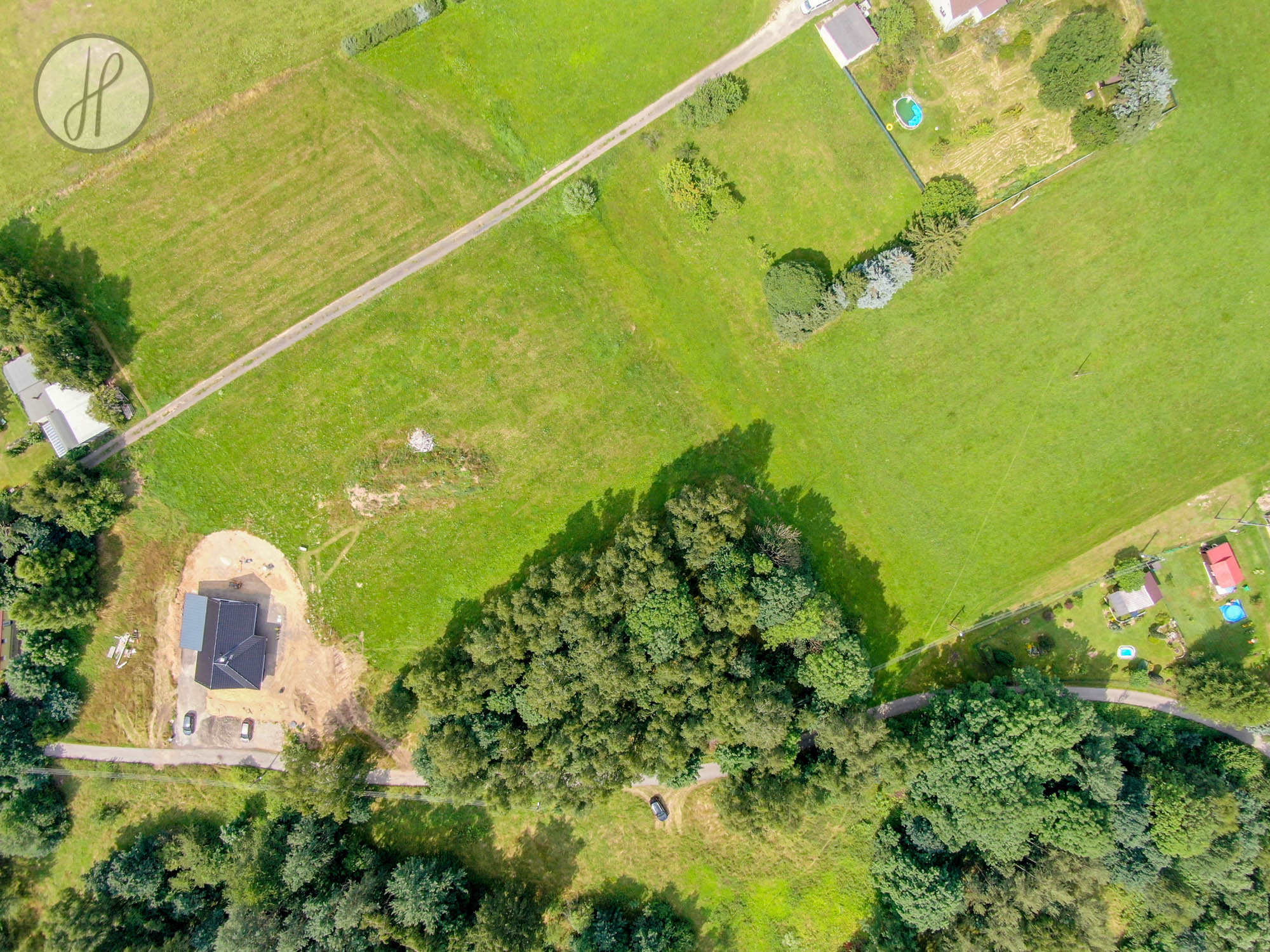 - Elektřina: nadzemní elektrické vedení na hranici pozemku.