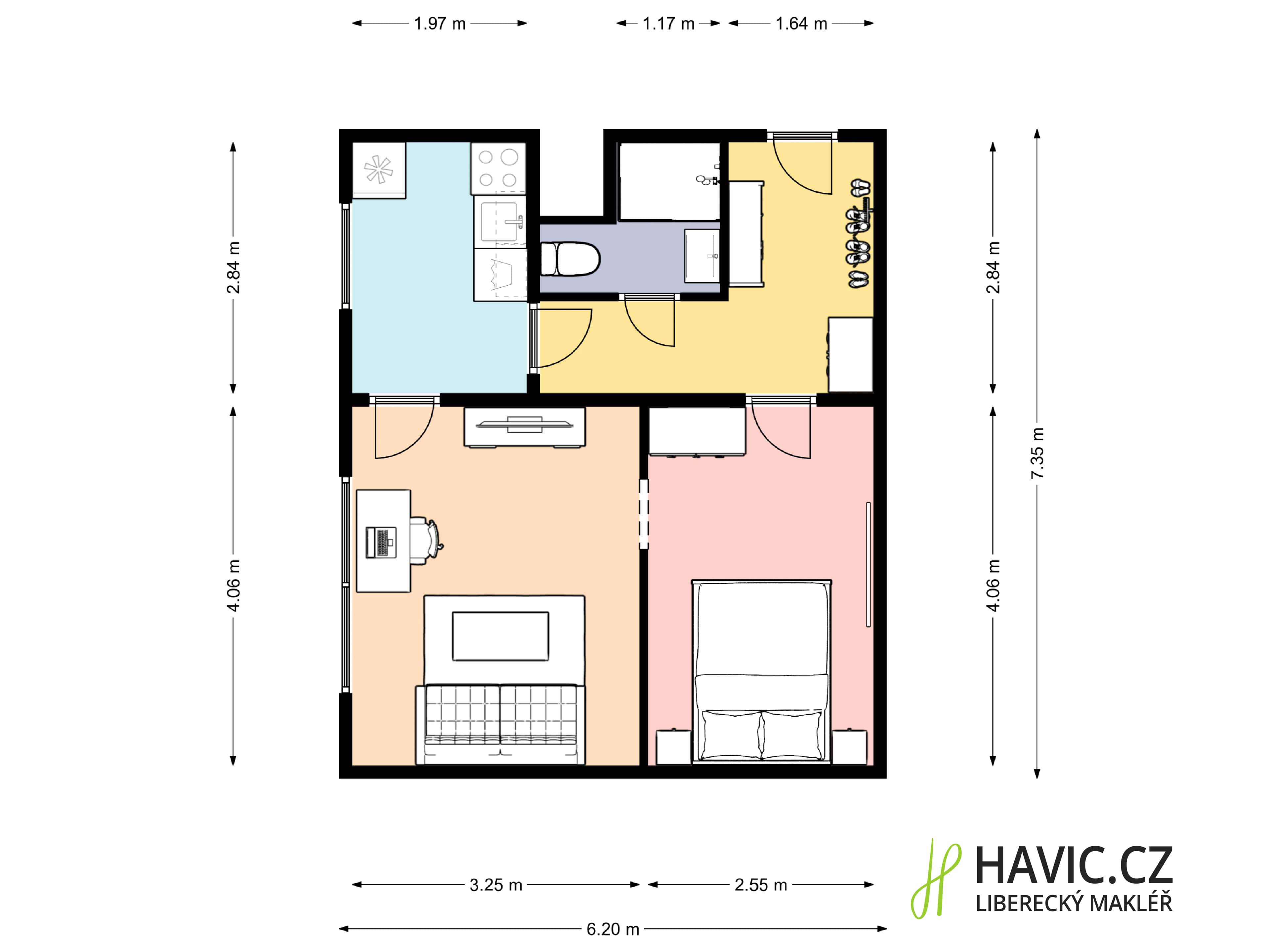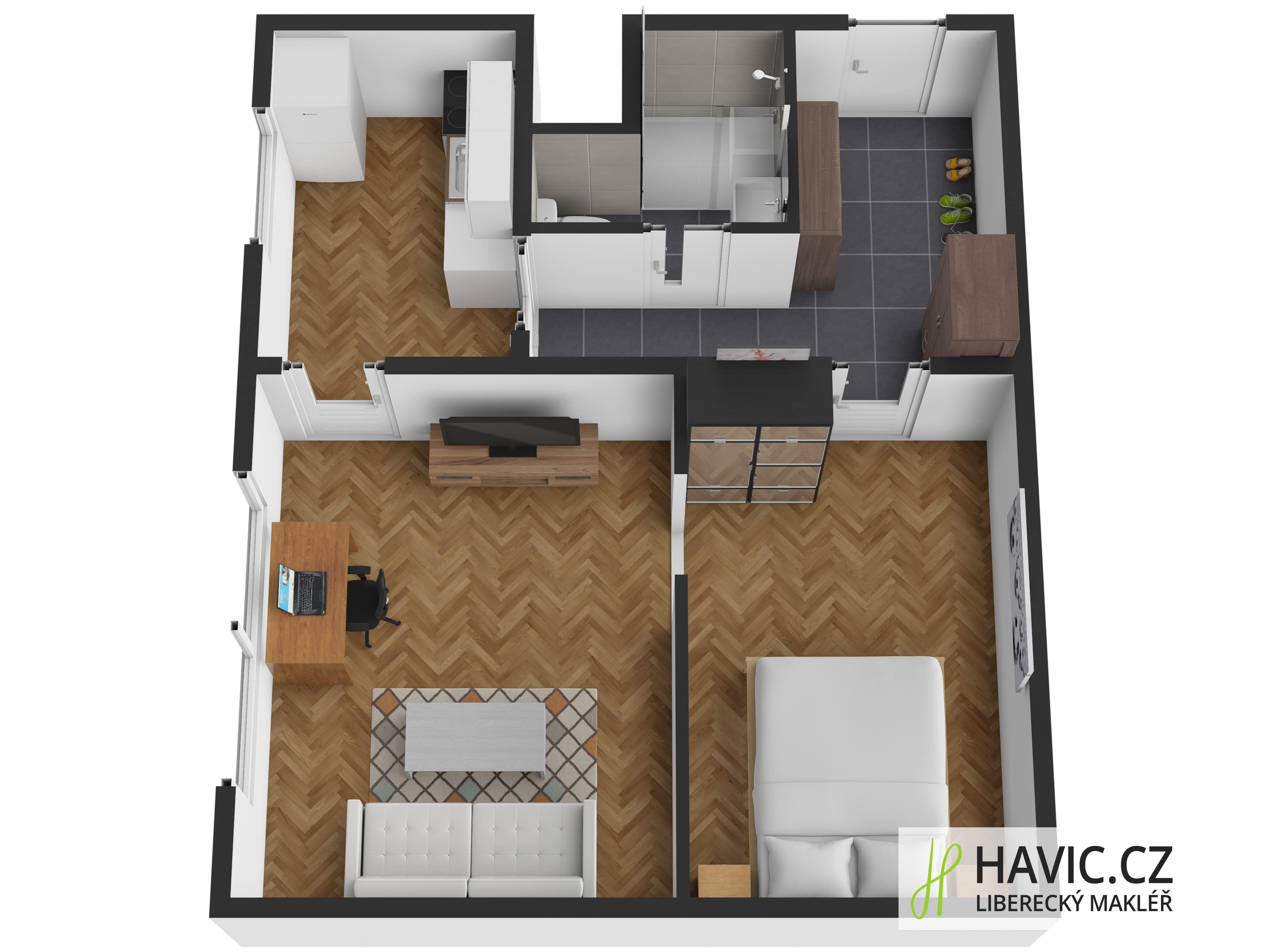 - Dispozice: Prostorná vstupní chodba, zděná koupelna s WC a obývací pokoj rozdělený na obývací a spací část s kuchyňským koutem.