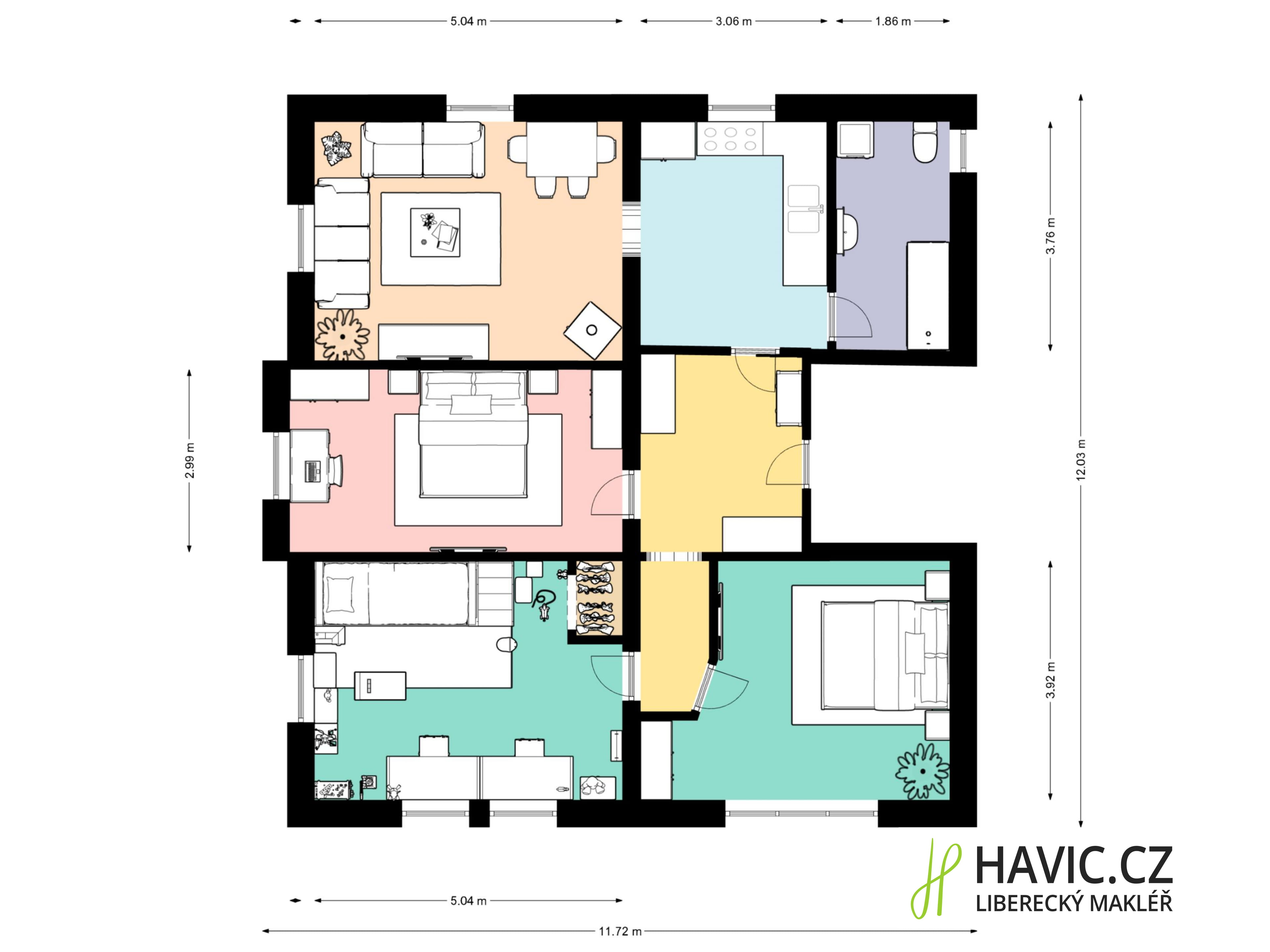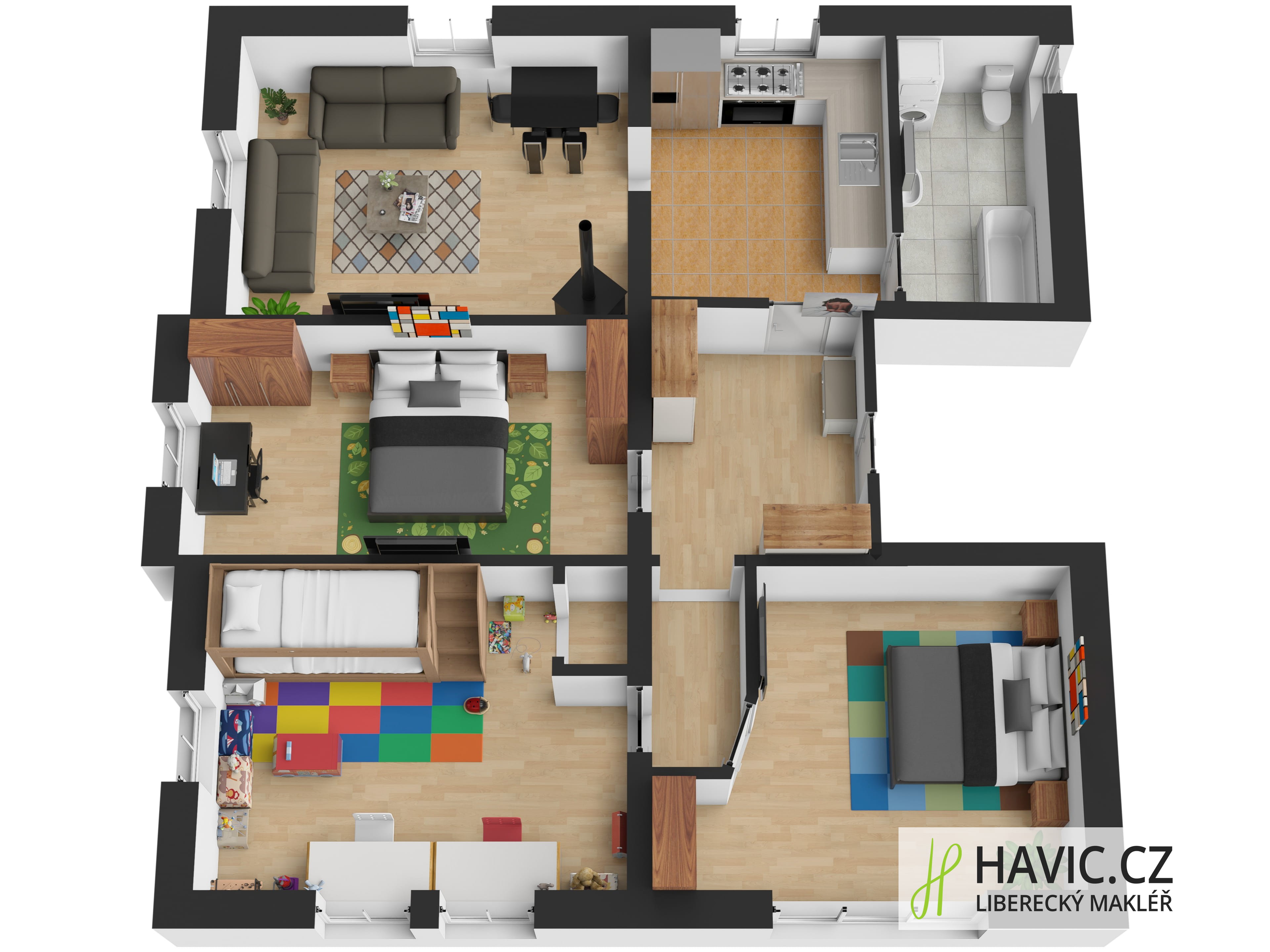 - Místnosti bytu: Tři samostatné a neprůchozí ložnice, obývací pokoj, kuchyň, chodba a koupelna s toaletou.