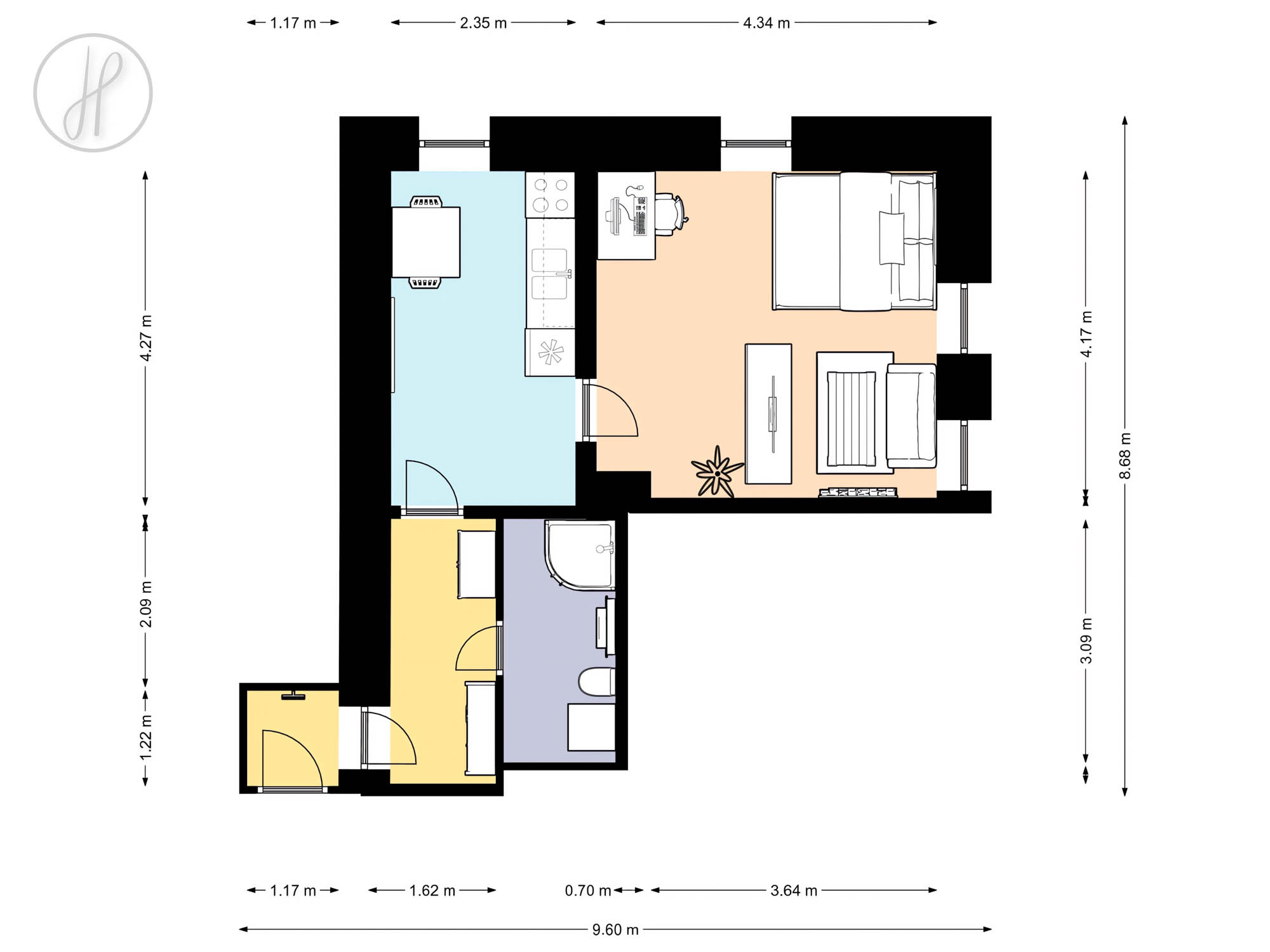 Dispozice jednotky: vstupní chodba, koupelna s WC, obývací pokoj s ložnicí a kuchyně. Podlahové krytiny jsou z keramické dlažby a PVC. Dům je napojen na rozvody - elektřina, obecní vodovod a kanalizace. Vytápění je řešeno ústředně elektrickým kotlem a o ohřev TUV se stará vlastní bojler. Oboje je je umístěno přímo v bytě.