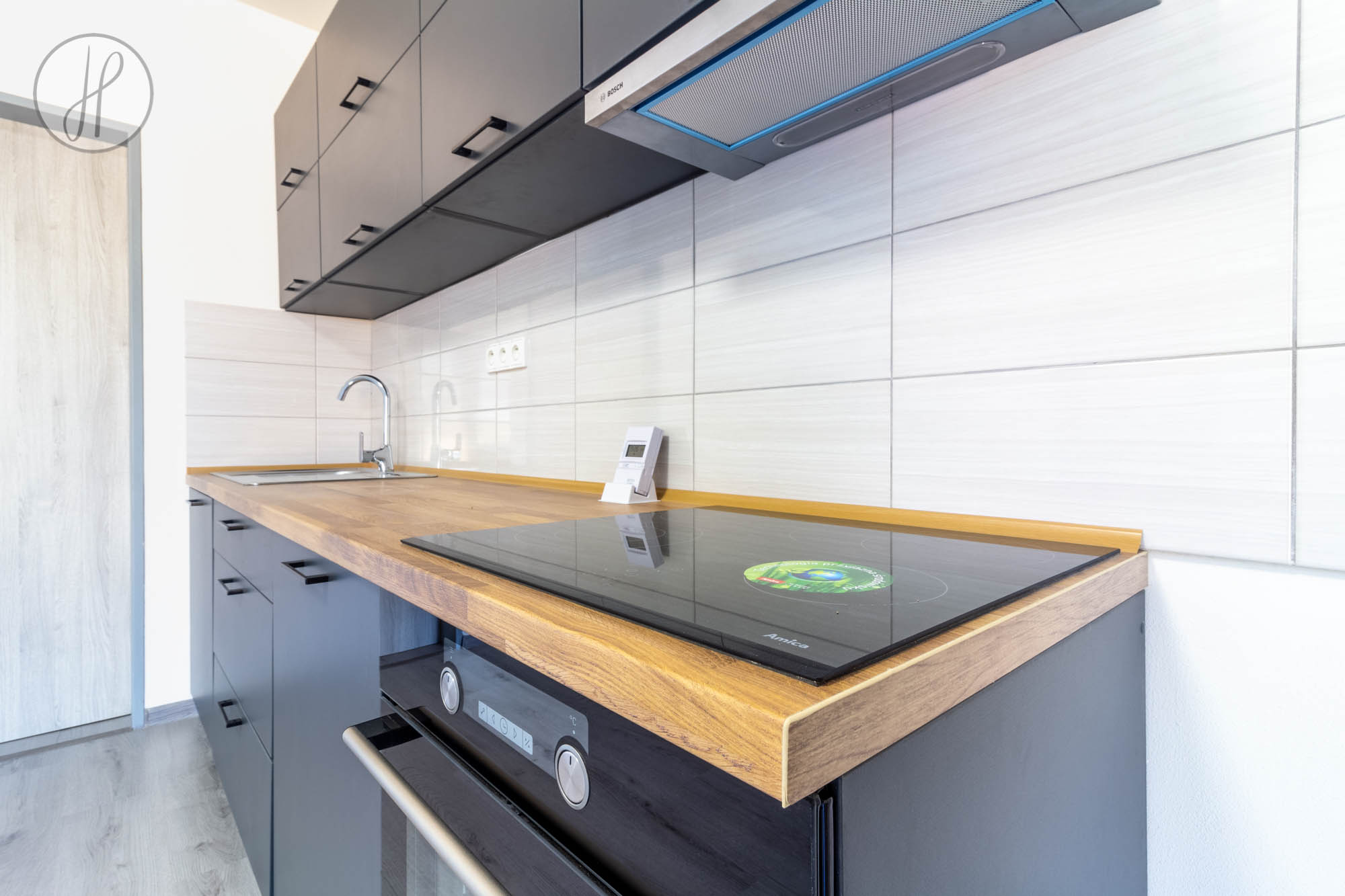 Součástí vybavení bytu je kotel, bojler, trouba se sklokeramickou deskou, digestoř a kuchyňská linka.