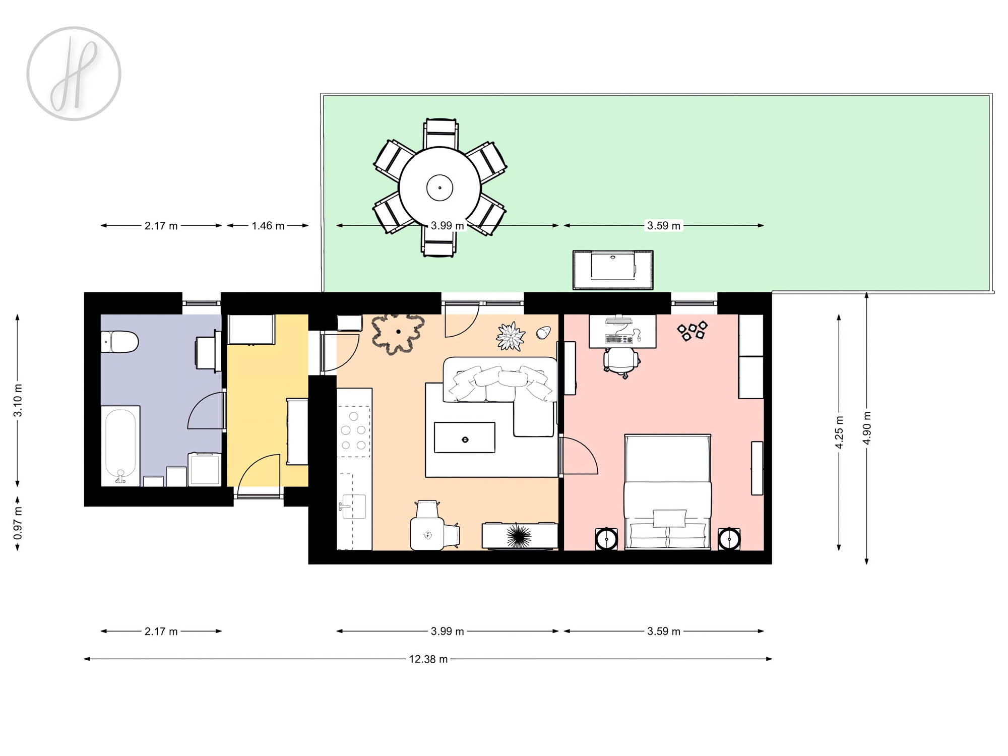 Dispozice jednotky: vstupní chodba, koupelna s WC, obývací pokoj s kuchyňským koutem a vstupem na vlastní předzahrádku a ložnice. Podlahové krytiny jsou z keramické dlažby a PVC. Dům je napojen na rozvody - elektřina, obecní vodovod a kanalizace. Vytápění je řešeno ústředně elektrickým kotlem a o ohřev TUV se stará vlastní bojler. Oboje je je umístěno přímo v bytě.