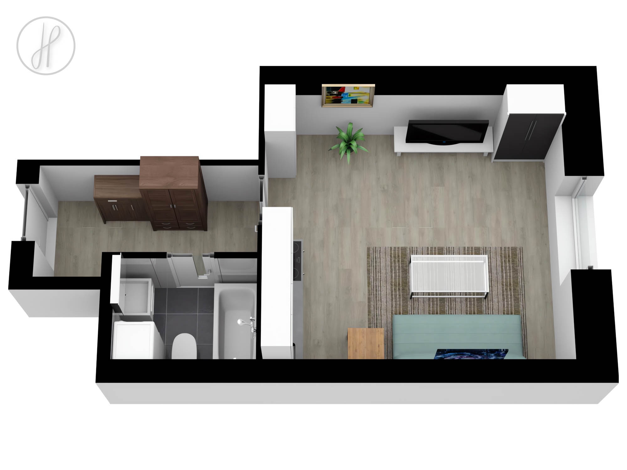Dispozice jednotky: vstupní chodba s praktickým koutem pro uložení věcí, koupelna s WC a pokoj s kuchyňským koutem. Podlahové krytiny jsou z keramické dlažby a PVC. Dům je napojen na veškeré rozvody (elektřina, obecní vodovod a kanalizace). Vytápění zajišťuje ústřední elektrický kotel a o ohřev vody se stará vlastní bojler přímo v bytě.