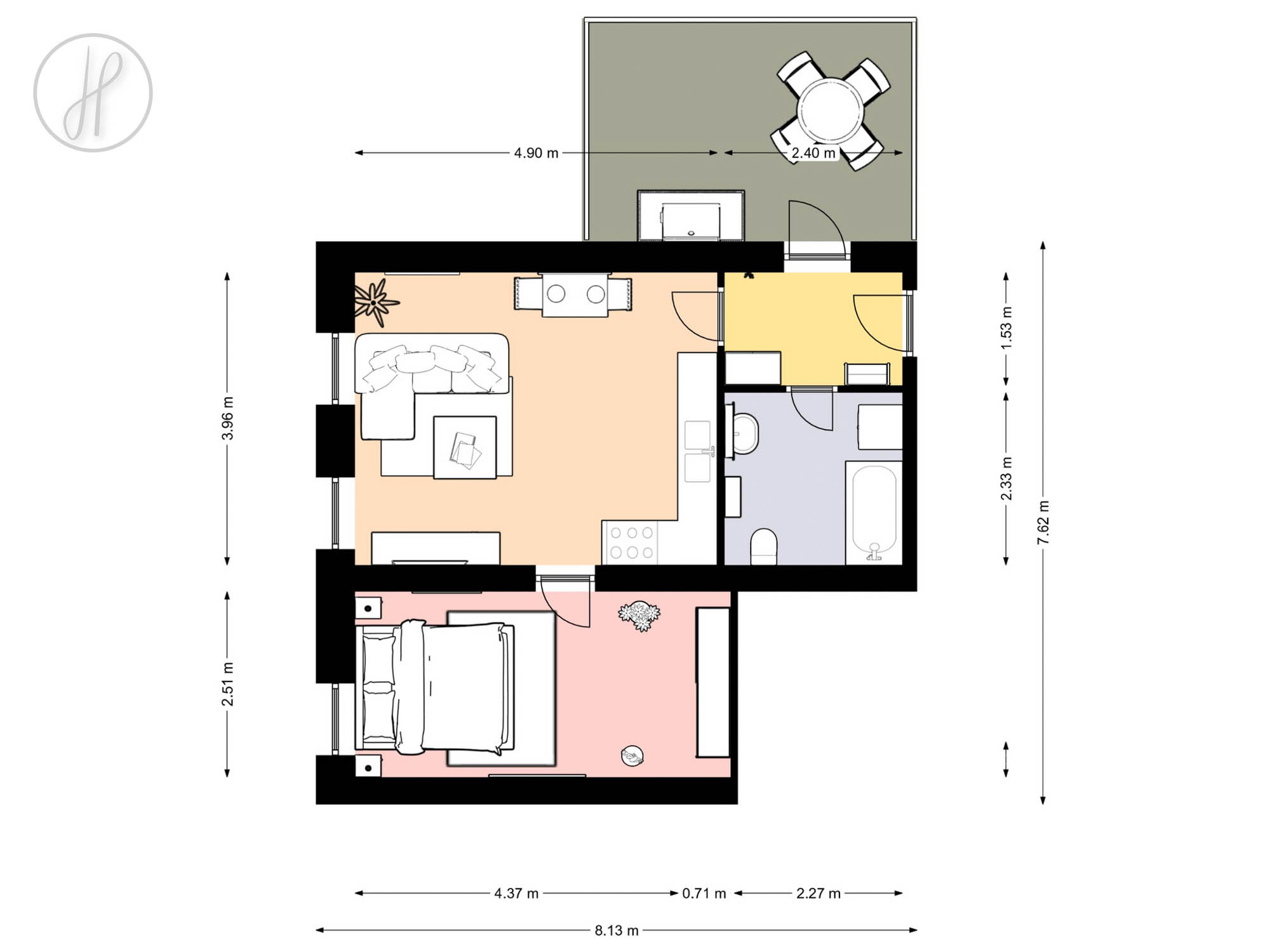 Jednotka o užitné ploše 41,77 m2 se nachází ve 3. NP zděného domu po kompletní rekonstrukci. Největším benefitem tohoto bytu je prostorná střešní terasa, na kterou je přístup přímo z chodby bytu.