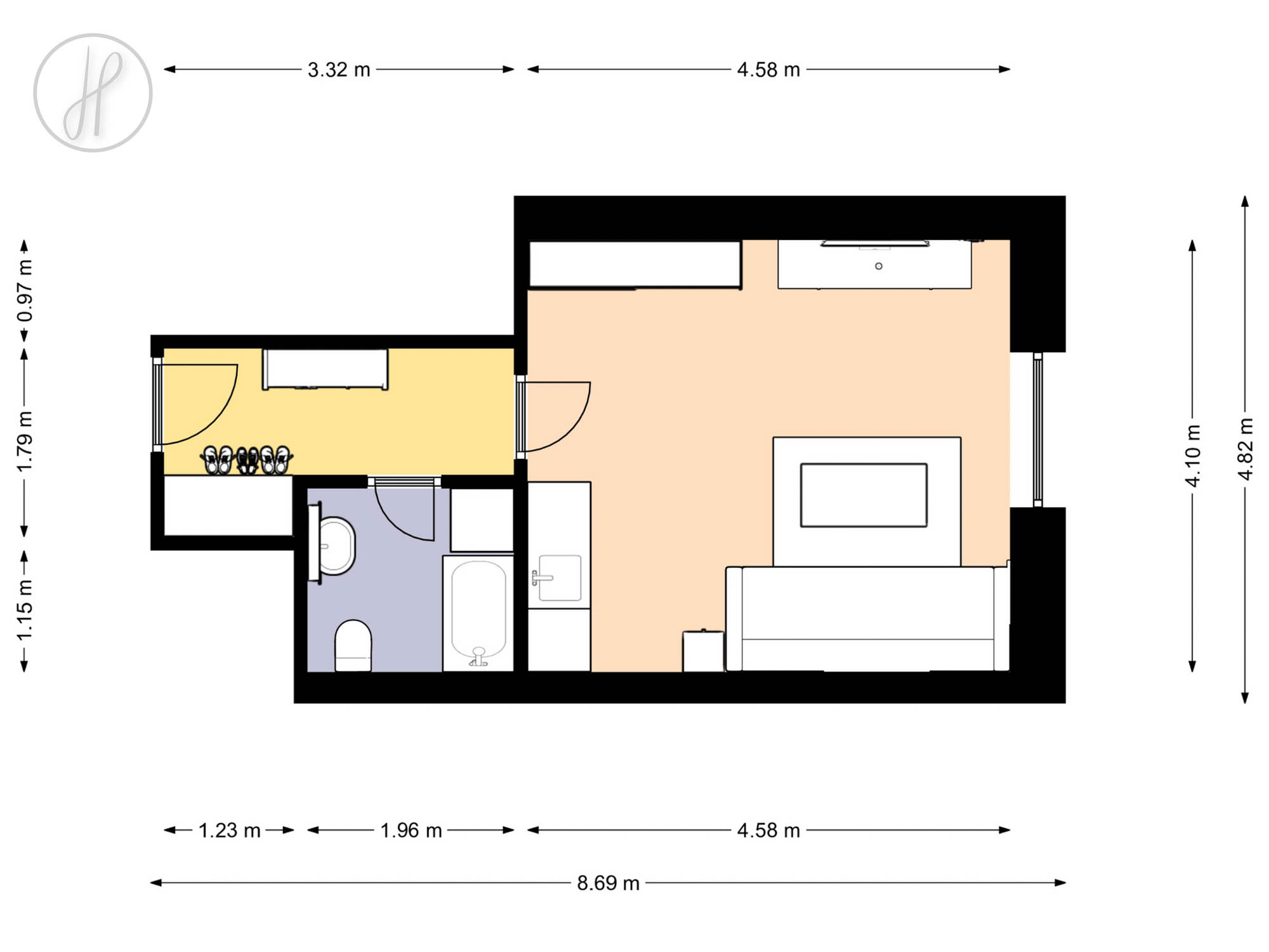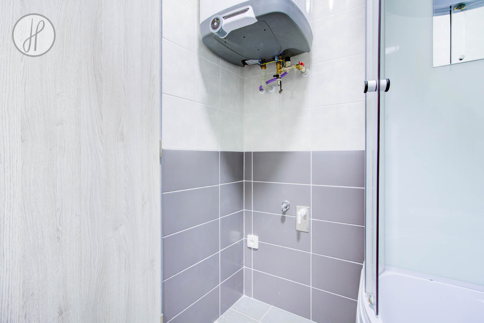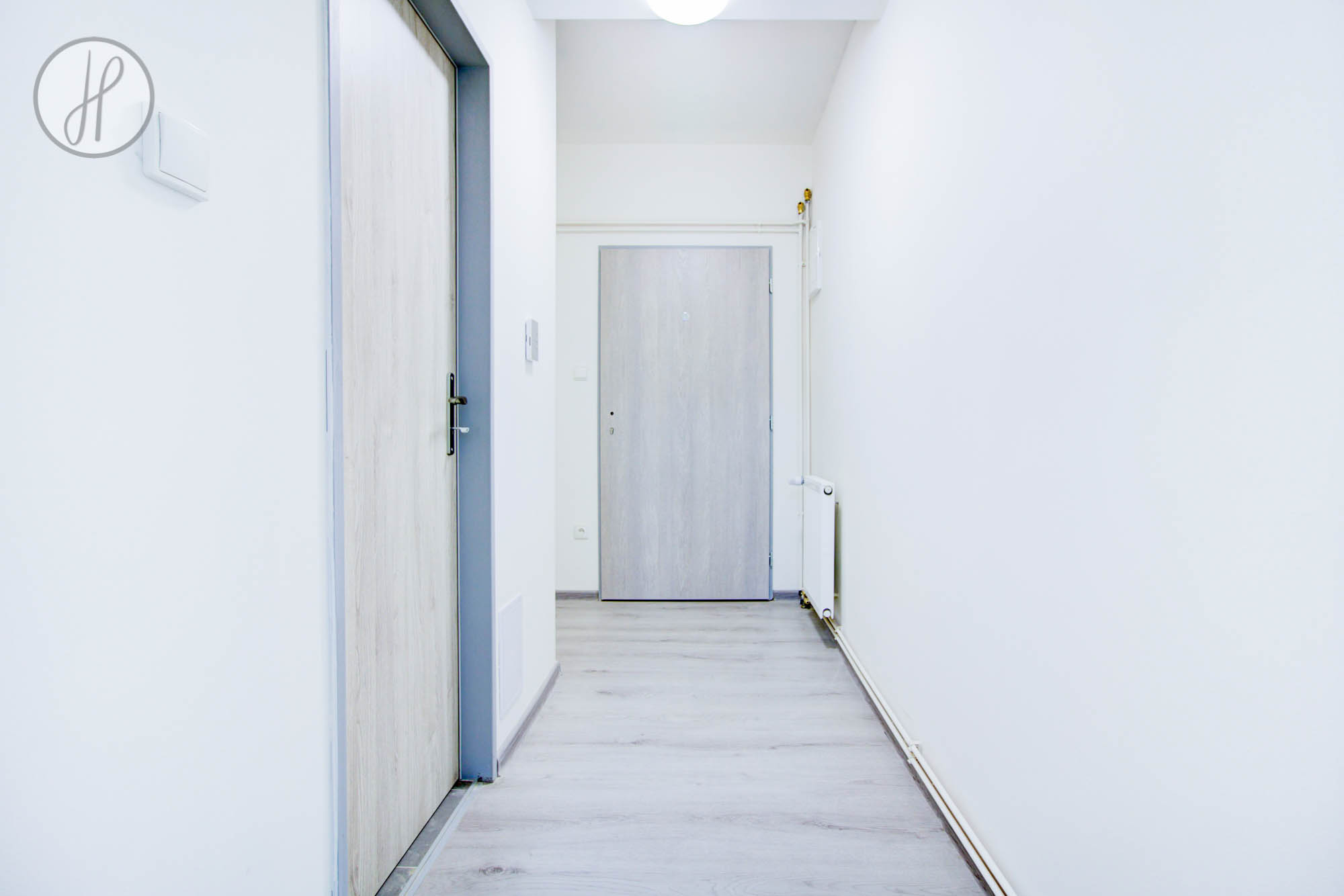 Dispozice jednotky: vstupní chodba s praktickým koutem pro uložení věcí, koupelna s WC a obývací pokoj s kuchyňským koutem. Podlahy tvoří keramická dlažba a PVC. Byt disponuje vlastním elektrickým kotlem pro vytápění a bojlerem pro ohřev vody, což umožňuje individuální regulaci komfortu.