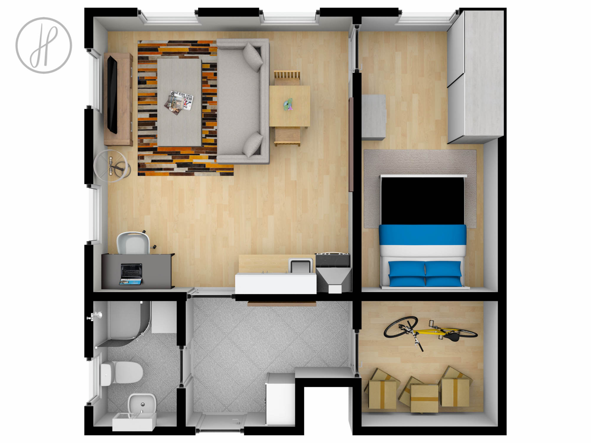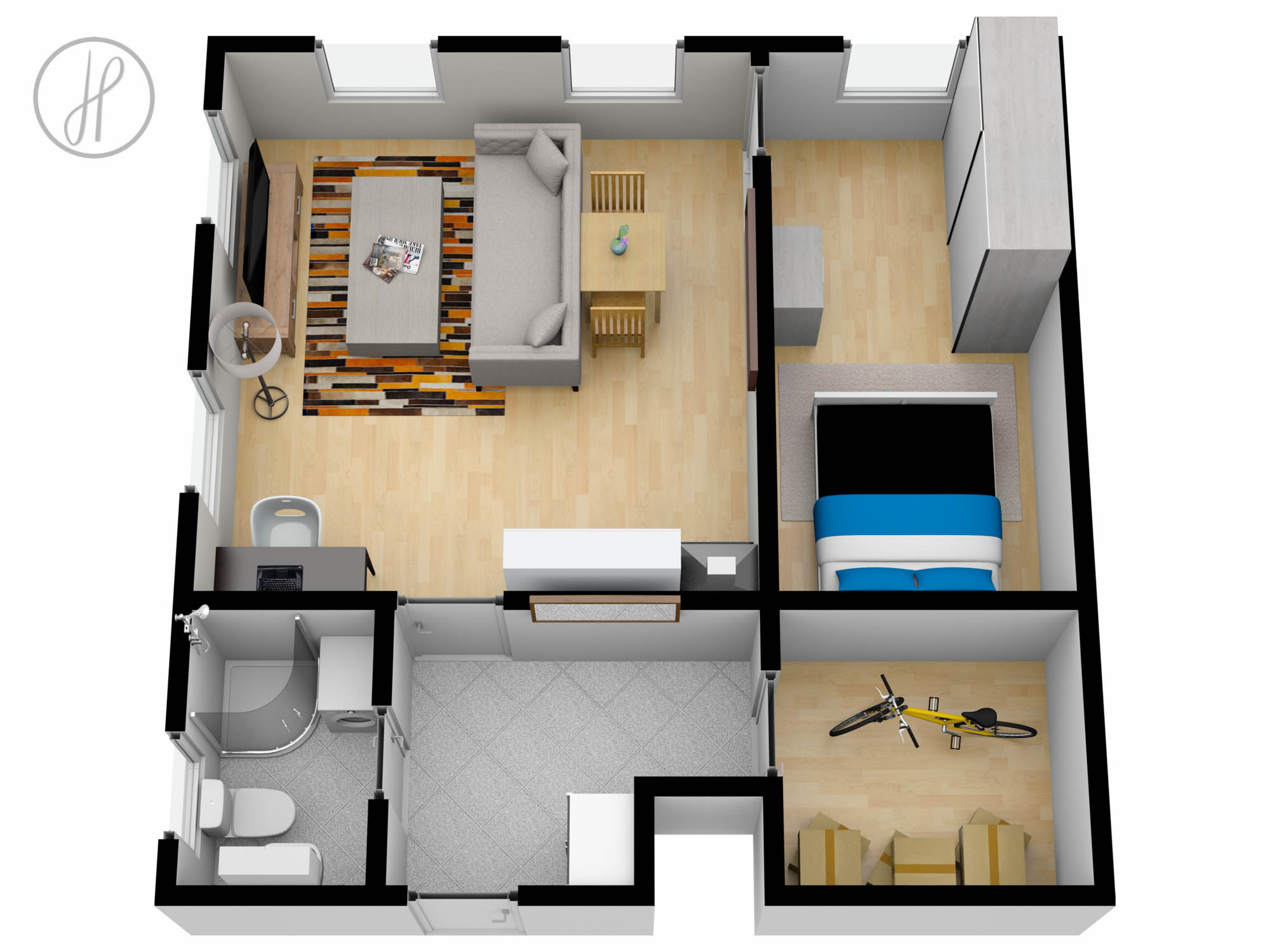 Dispozice jednotky: vstupní chodba, koupelna s WC, obývací pokoj s kuchyňským koutem, ložnice a velmi praktický prostorný sklad přímo v bytě. Podlahové krytiny tvoří PVC linoleum a dlažba.