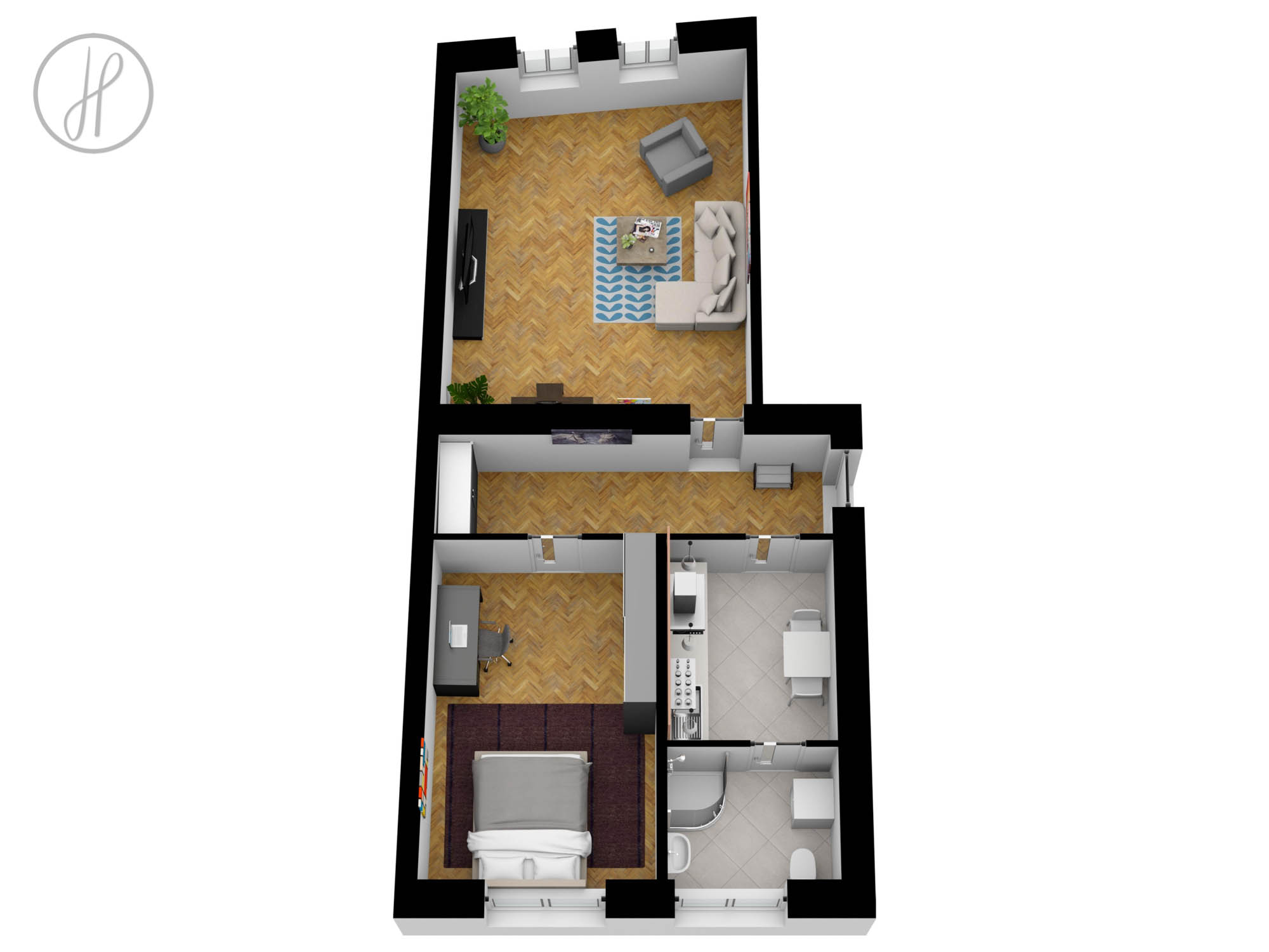 Dispozice jednotky: praktická vstupní chodba, zděná koupelna s WC, velkorysý obývací pokoj, ložnice a samostatná kuchyně.