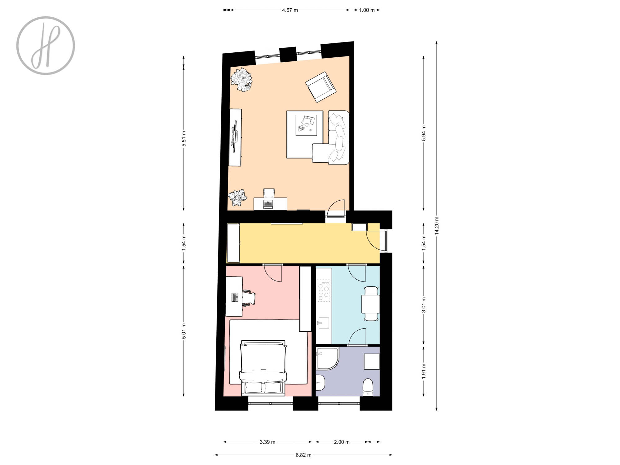 Tento prostorný byt o užitné ploše 60,47 m2 je situován ve 4. NP cihlového domu, který prošel precizní a kompletní rekonstrukcí. Díky umístění ve vyšším patře nabízí byt klidné bydlení s pěkným výhledem, přestože se nacházíte přímo v centru dění.