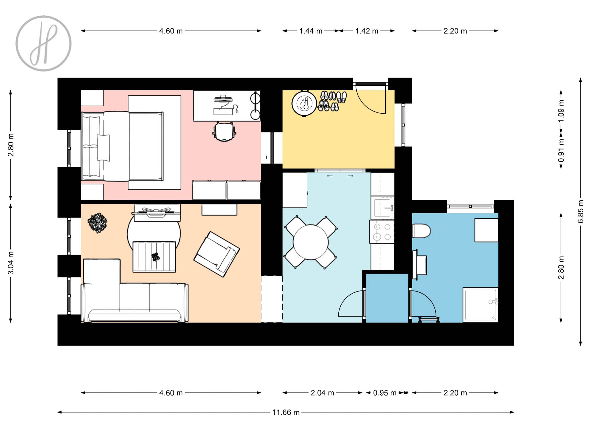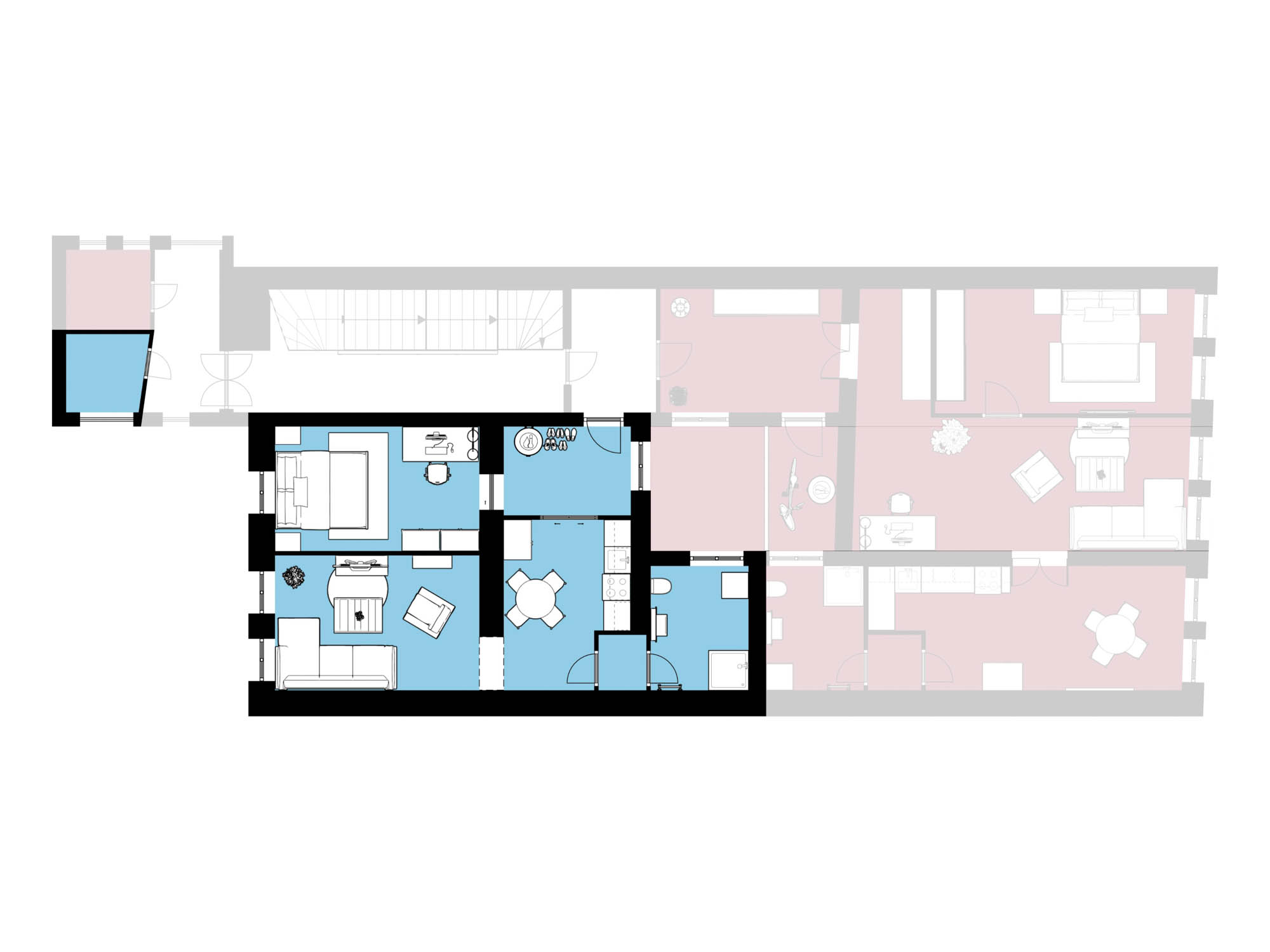 Jednotka č. 4 o ploše 53,35 m2 je situována ve 3. NP reprezentativního zděného domu. Celý objekt prošel náročnou a kompletní rekonstrukcí, která citlivě spojuje historické prvky s požadavky na moderní bydlení.