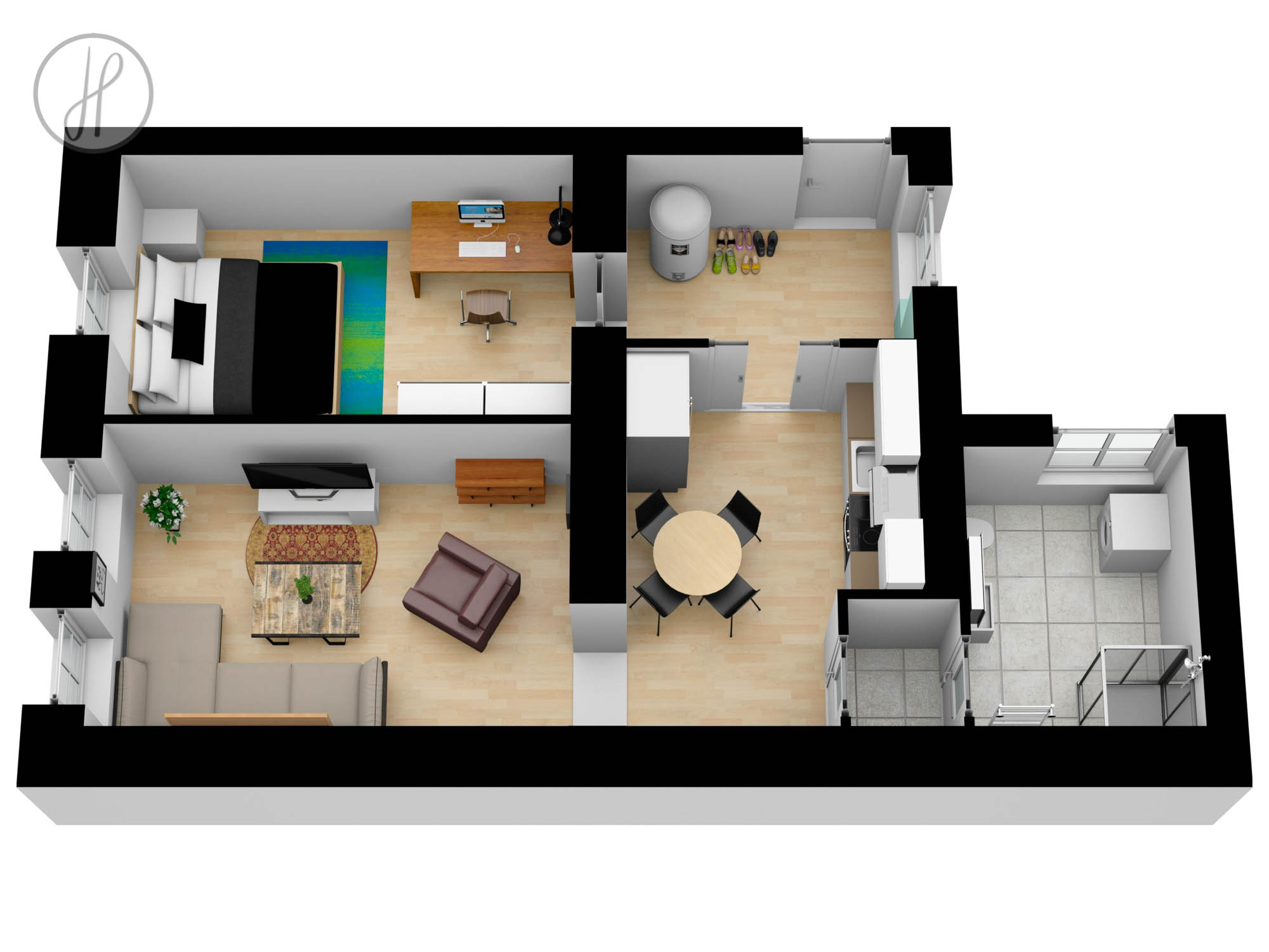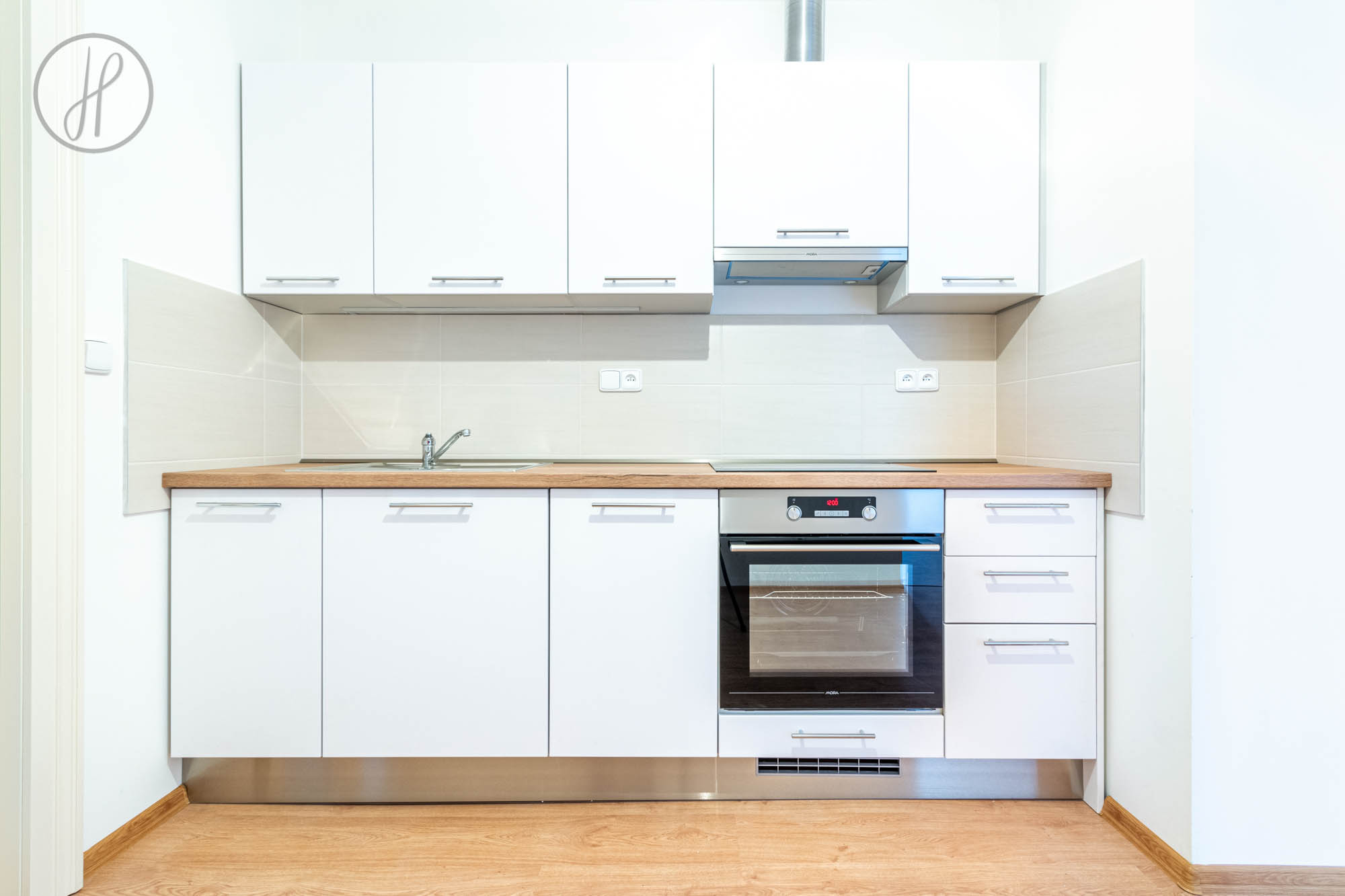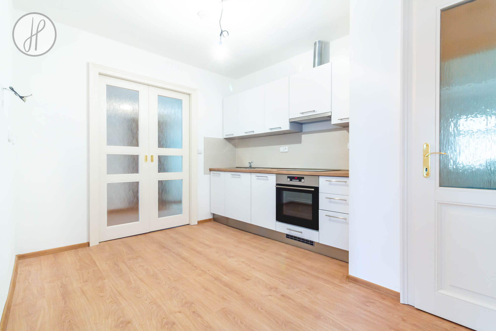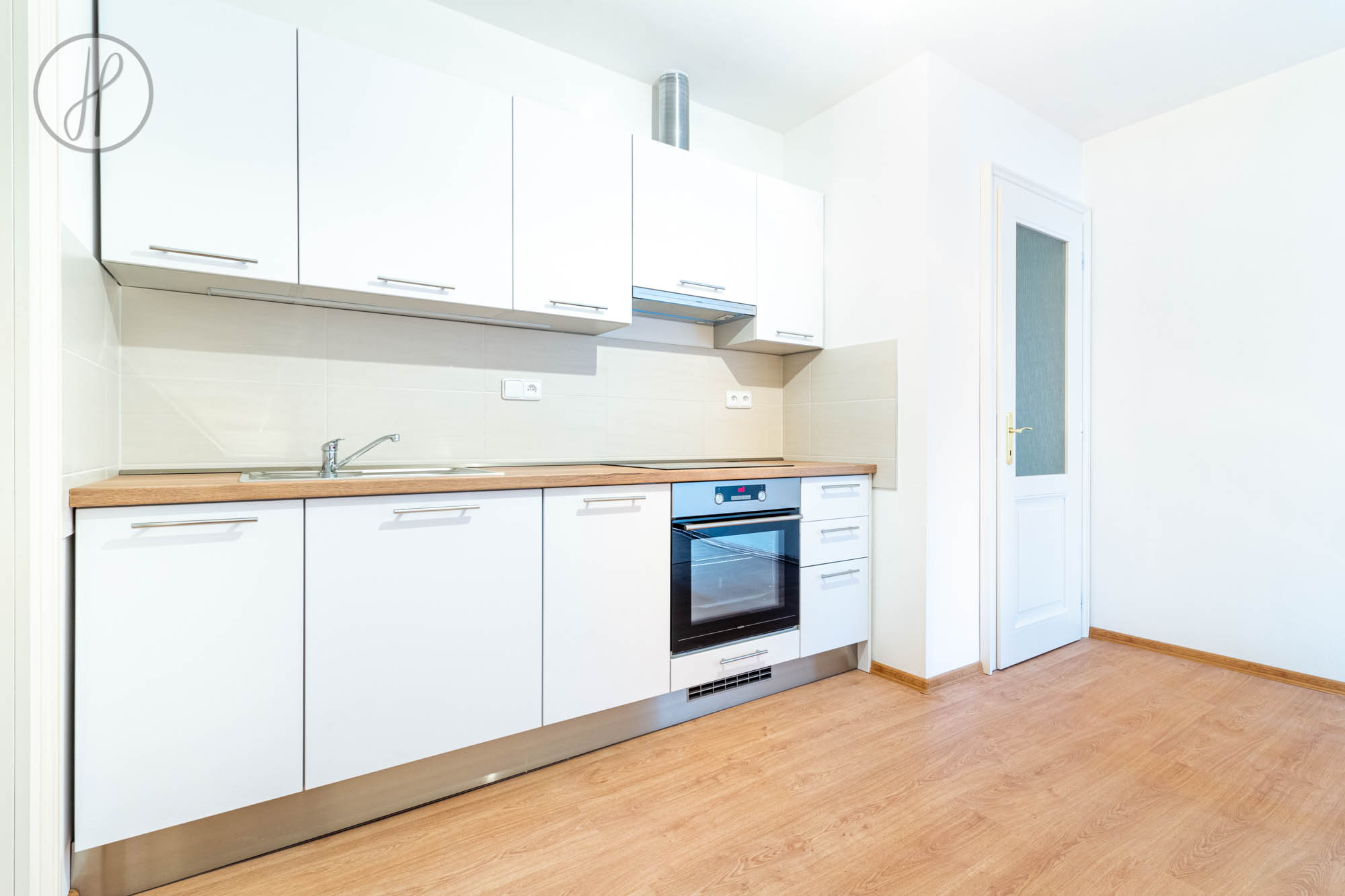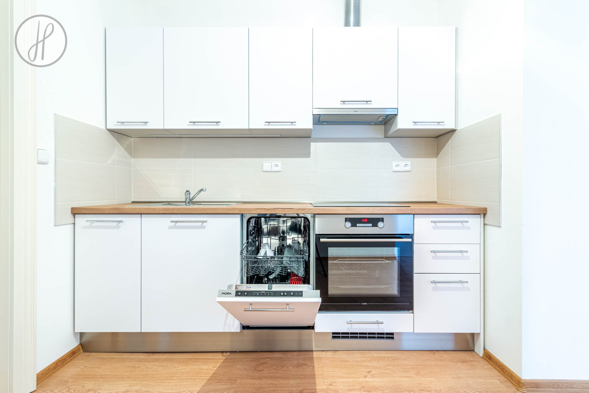 Dispozice a vybavení: Interiér tvoří vstupní chodba, koupelna s WC, ložnice a obývací pokoj s navazující kuchyní. Kuchyňská linka je osazena vestavnými spotřebiči, přičemž velkou výhodou je integrovaná myčka na nádobí. K bytu náleží také praktická úložná kóje přístupná ze společné chodby.