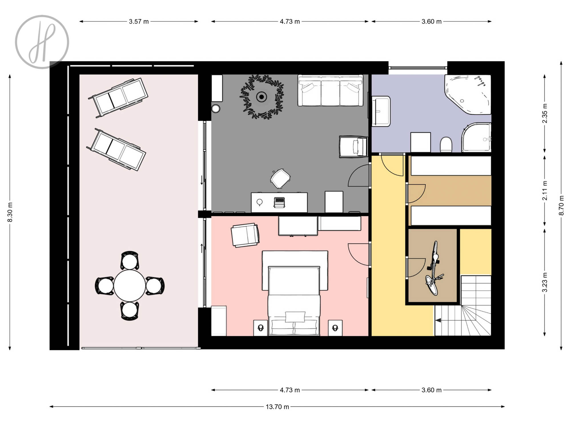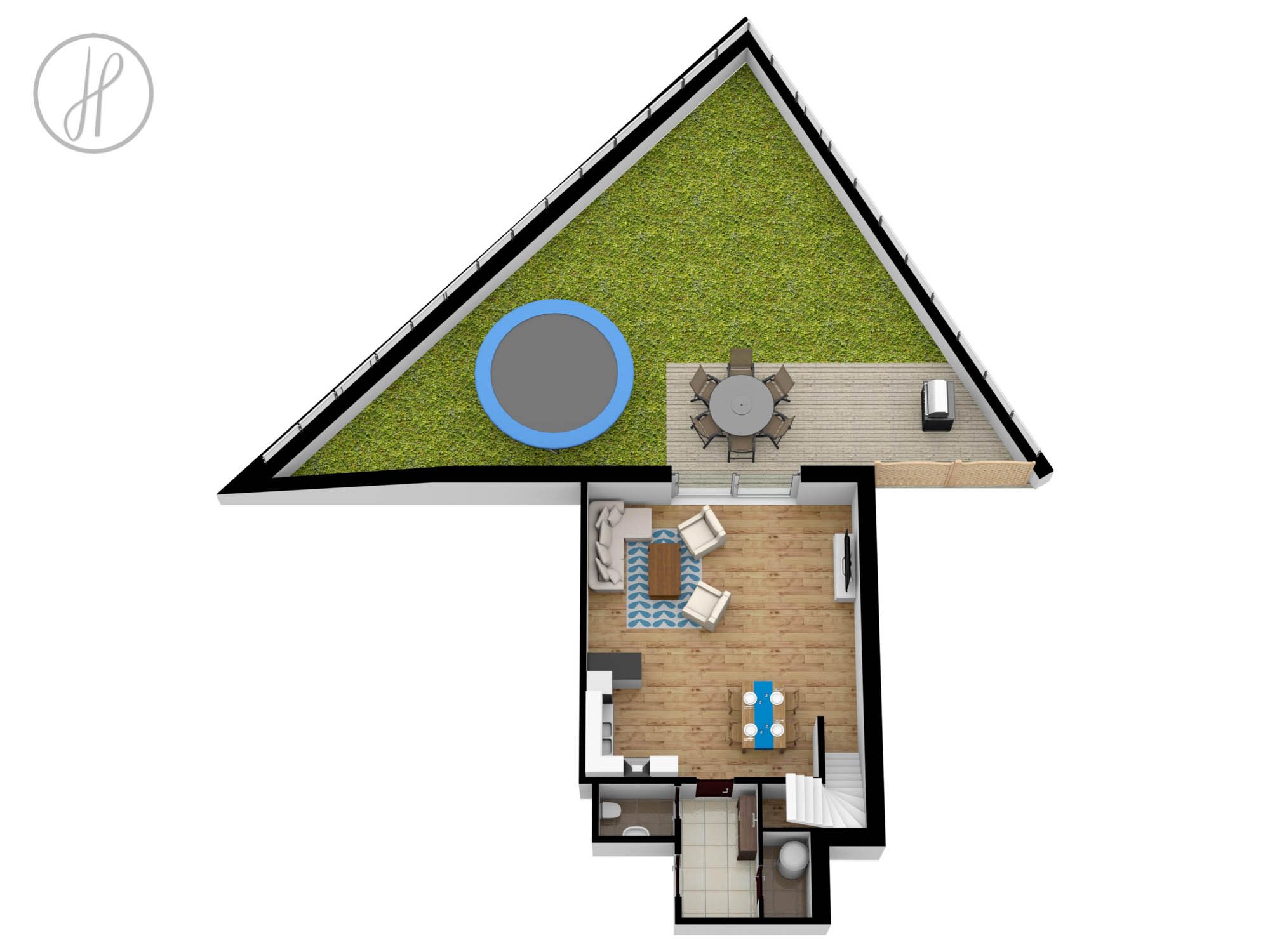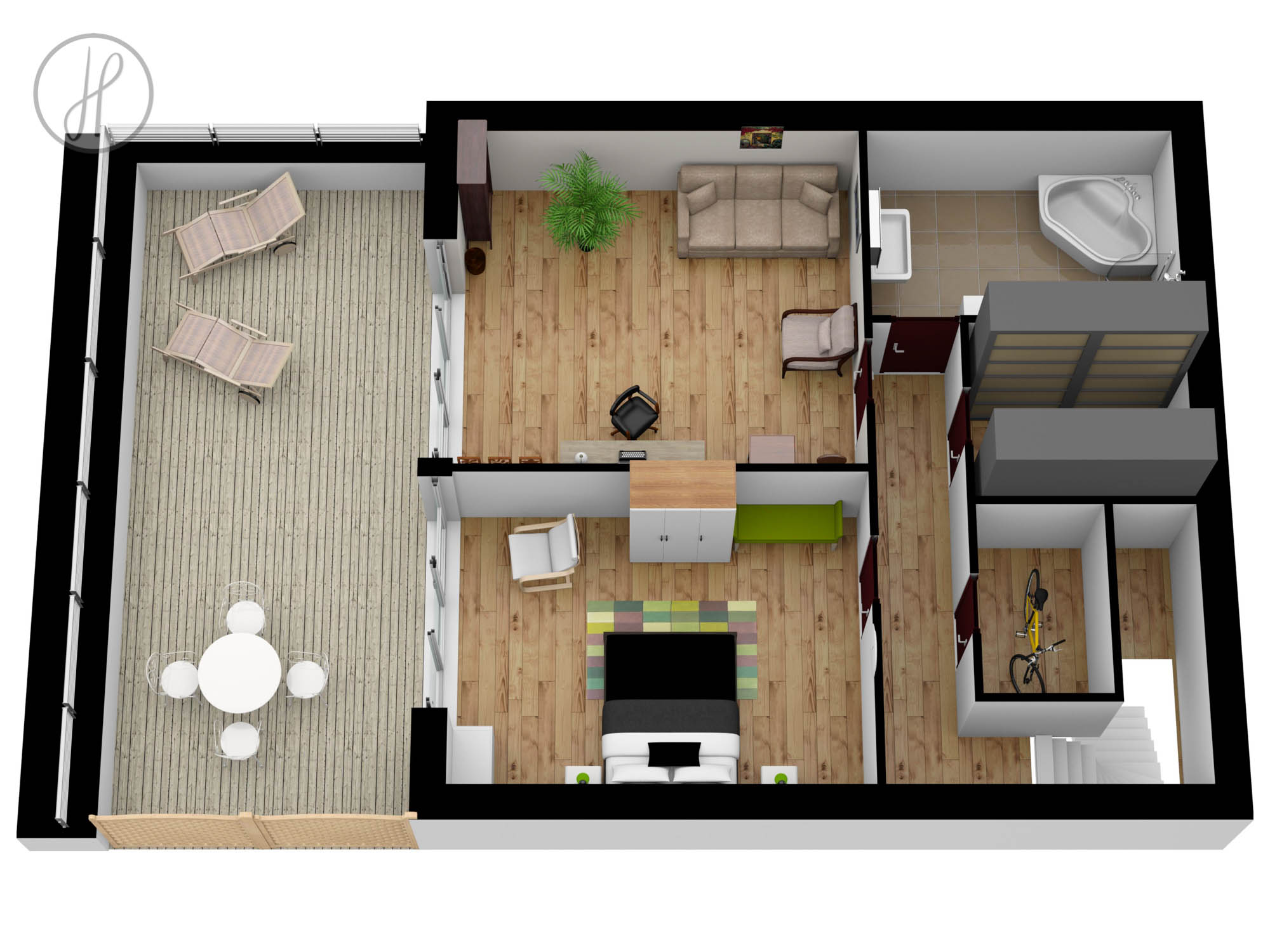 Dispozice jednotky: V přízemí bytu se nachází vstupní chodba, samostatná koupelna, obývací pokoj s kuchyňským koutem a vstupem na velkou terasu s výhledem na libereckou radnici. V patře pak nalezneme dvě samostatné ložnice s francouzskými okny a vstupem na obrovskou terasu, koupelnu s toaletou a dvě prostorné šatny. Podlahové krytiny jsou dřevěné a v koupelně, na toaletě a chodbě je keramická dlažba.