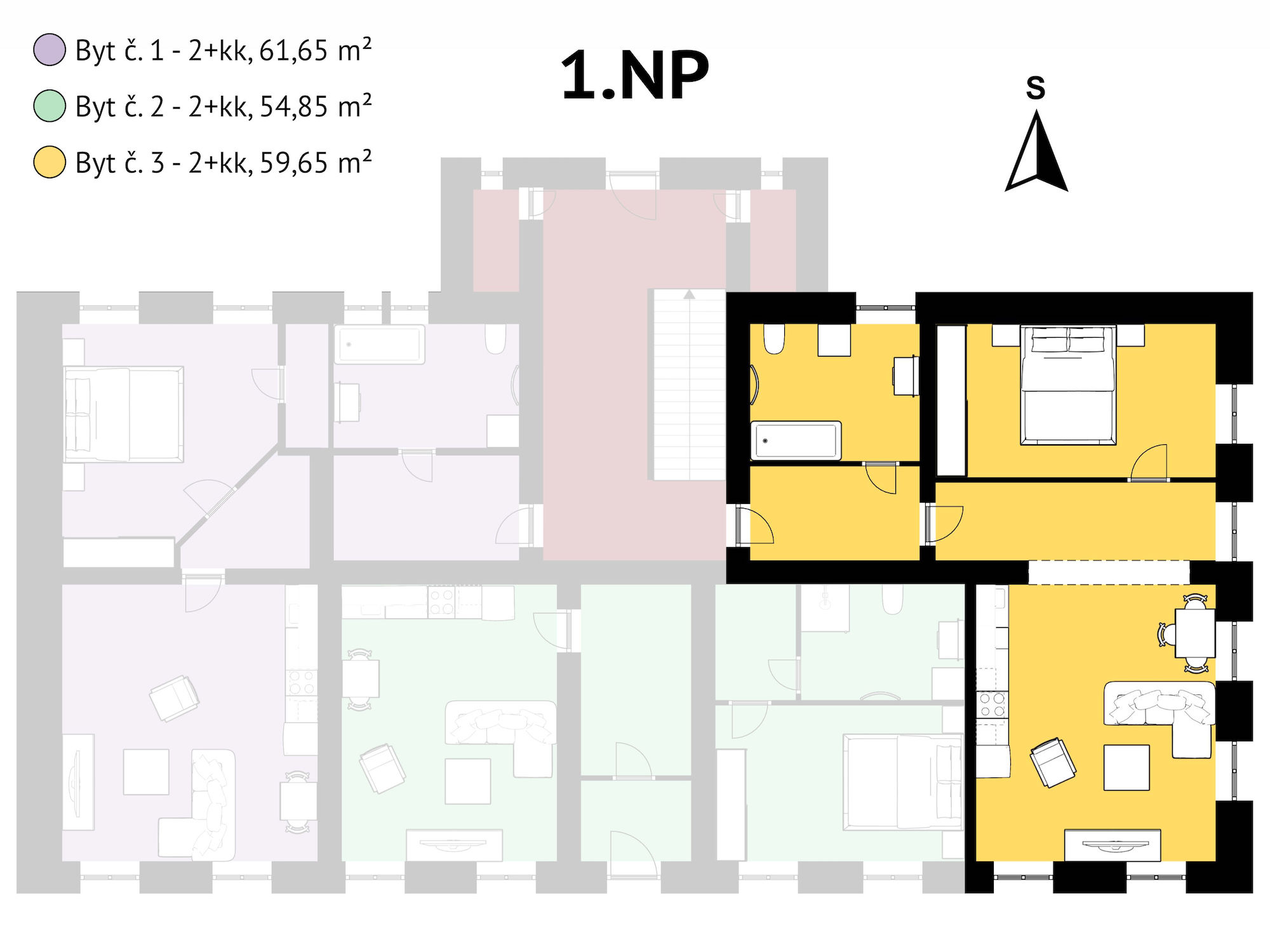Jednotka o užitné ploše 59,65 m2 se nachází v 1. NP zděného domu po kompletní rekonstrukci.