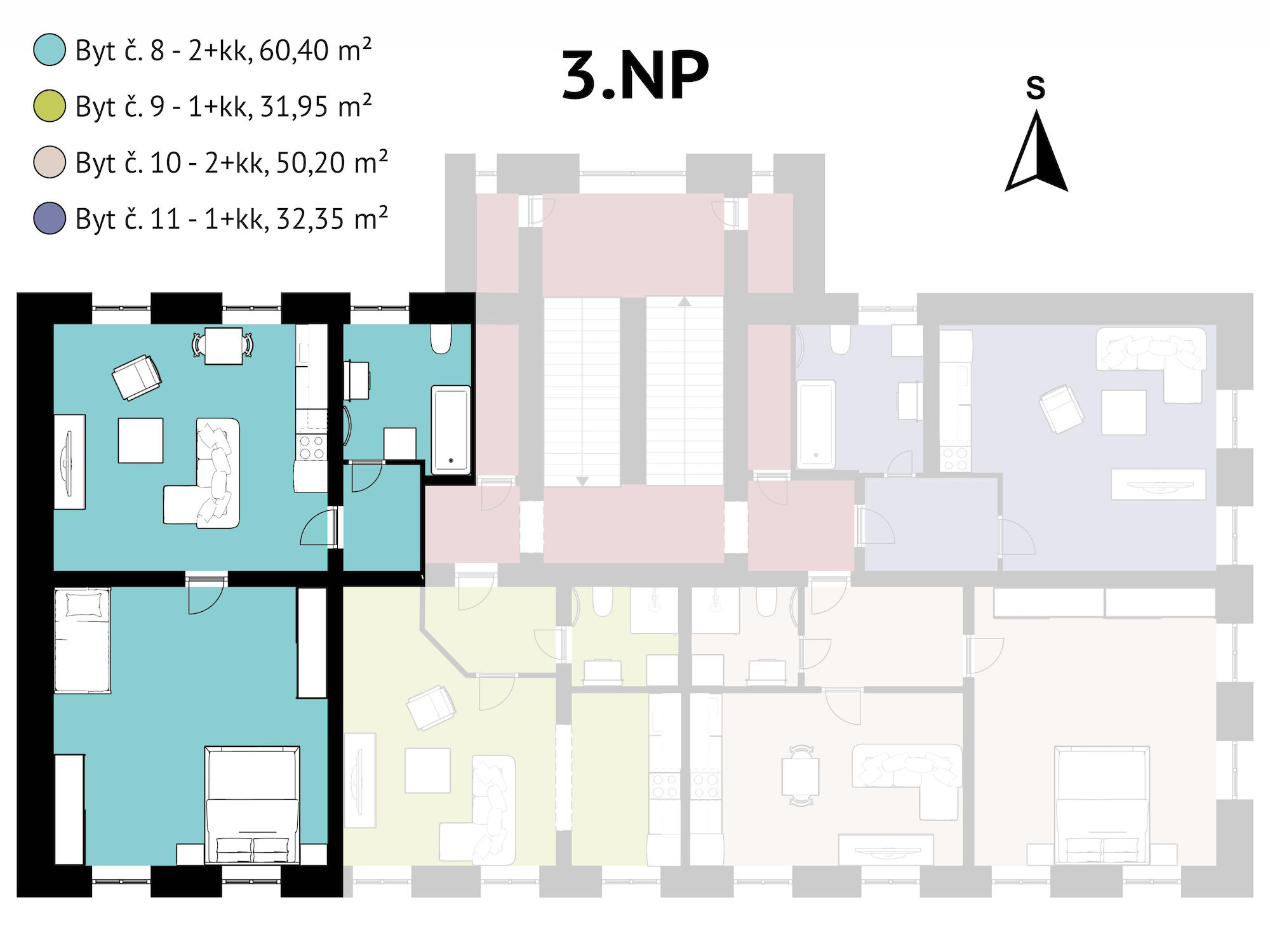Jednotka o podlahové ploše 60,40 m2 se nachází ve 3. NP zděného domu po kompletní rekonstrukci.