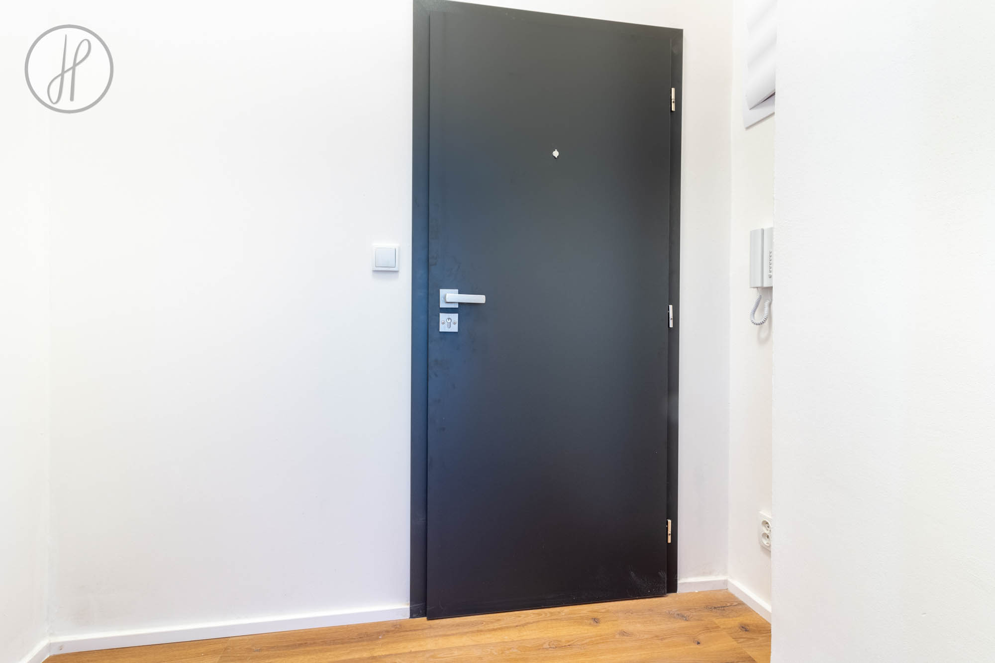 Dispozice jednotky: vstupní chodbička, koupelna s WC a obývací pokoj s kuchyňským koutem, ložnice. Podlahové krytiny jsou ze skládaného vinylu na click v kombinaci s keramickou dlažbou v koupelně. Dveře obložkové a bezfalcové. V kuchyňské lince na míru jsou osazeny vestavné spotřebiče (sklokeramická varná deska, recirkulační digestoř, trouba a myčka).