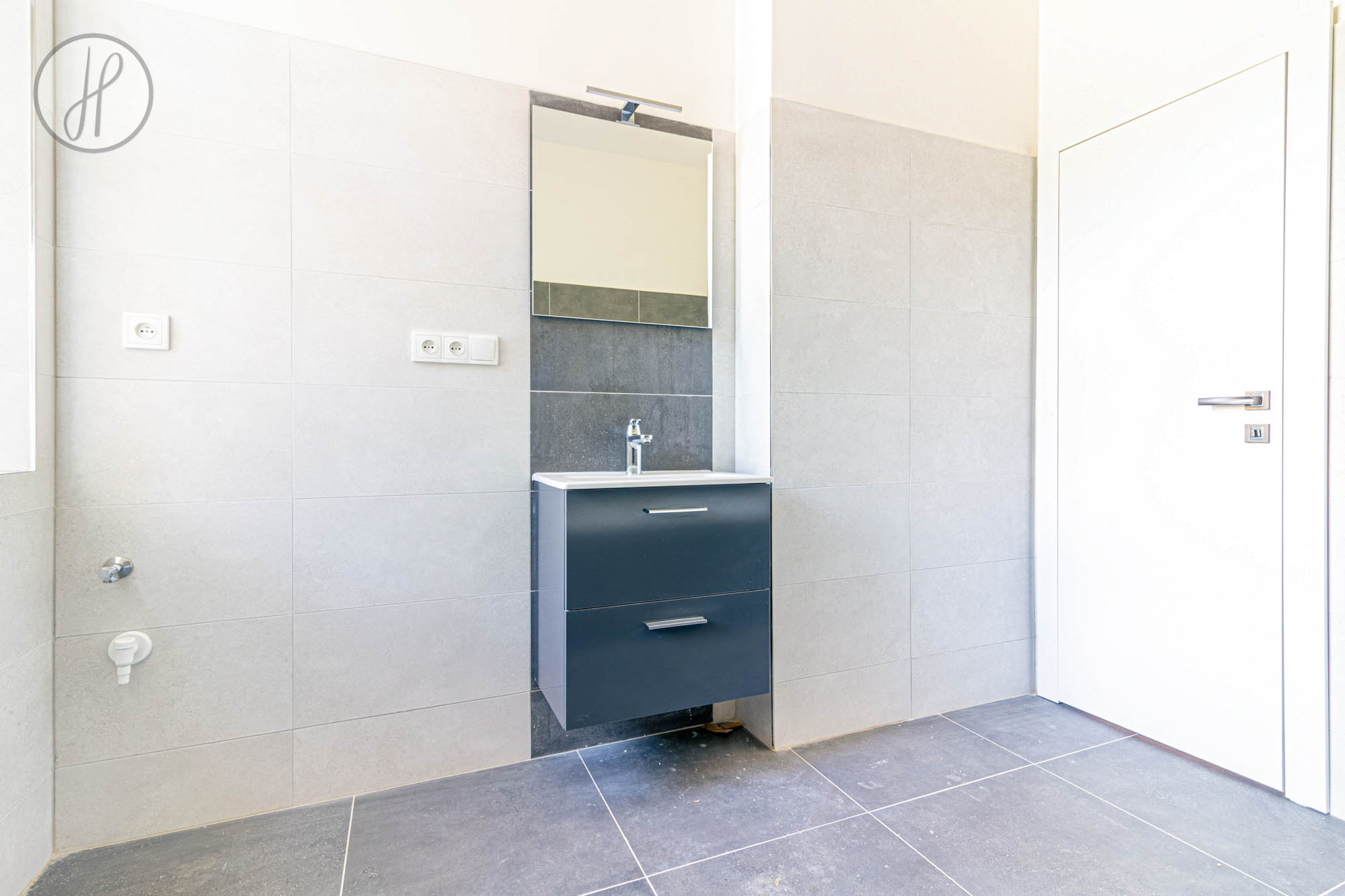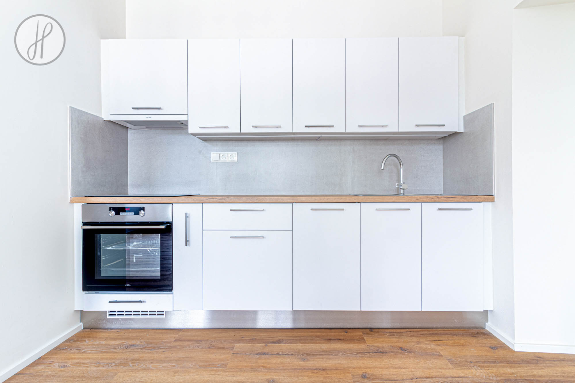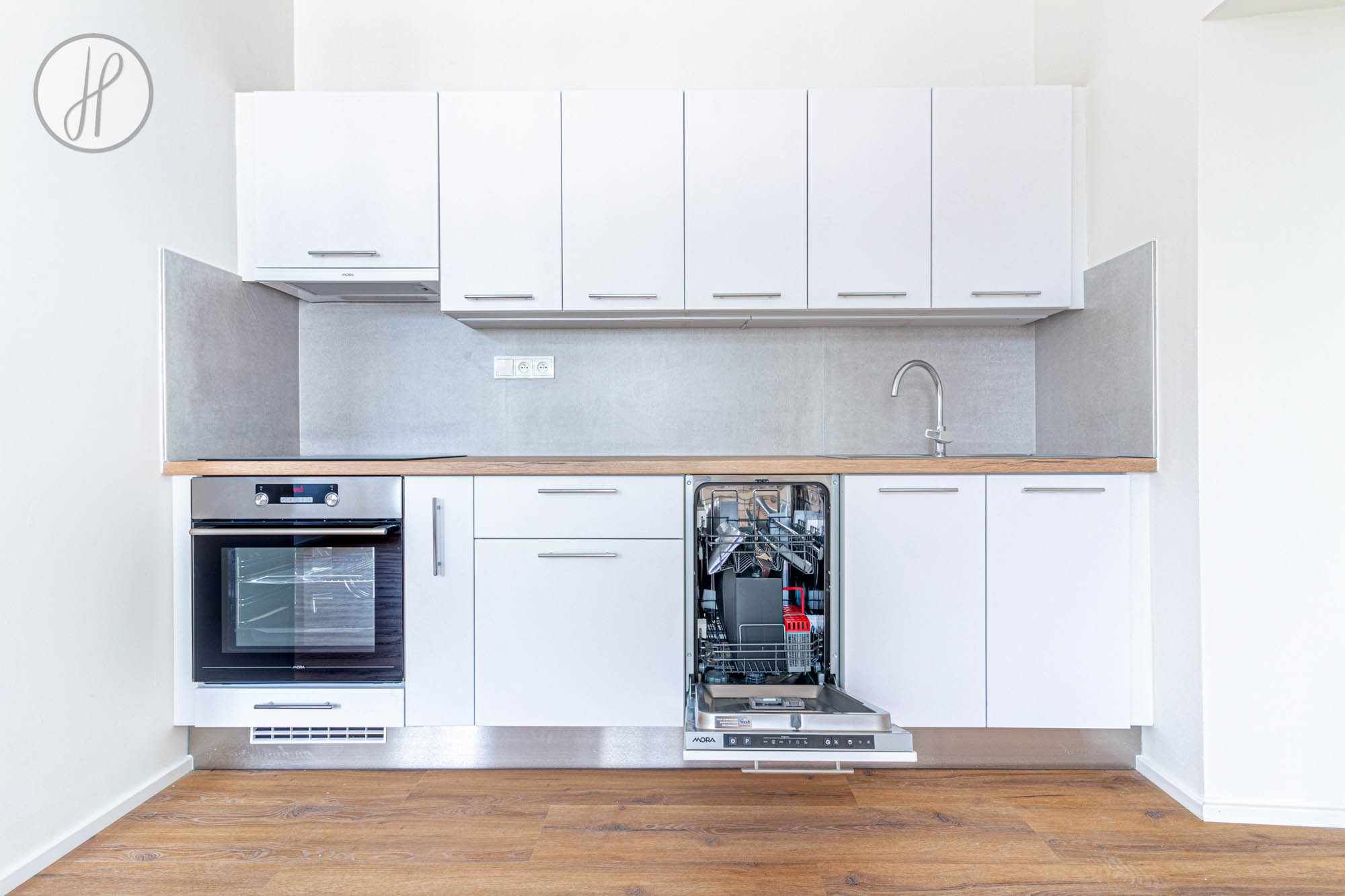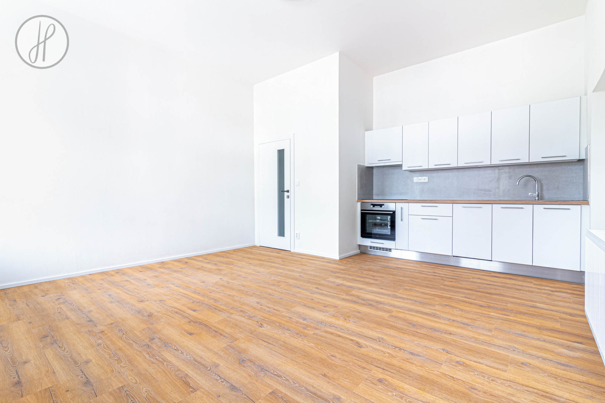 Dispozice jednotky: vstupní chodbička, koupelna s WC a obývací pokoj s kuchyňským koutem. Podlahové krytiny jsou ze skládaného vinylu na click v kombinaci s keramickou dlažbou v koupelně. Dveře obložkové a bezfalcové. V kuchyňské lince na míru jsou osazeny vestavné spotřebiče (sklokeramická varná deska, recirkulační digestoř, trouba a myčka).