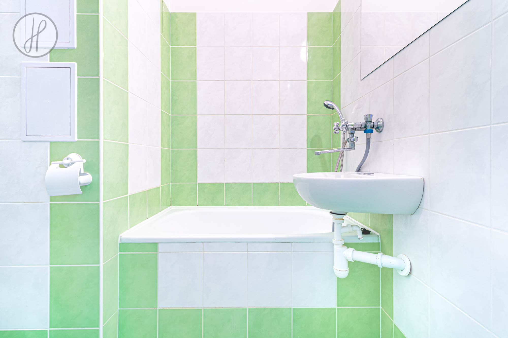 - Materiály: Laminátové plovoucí podlahy, v koupelně je položena keramická dlažba.
