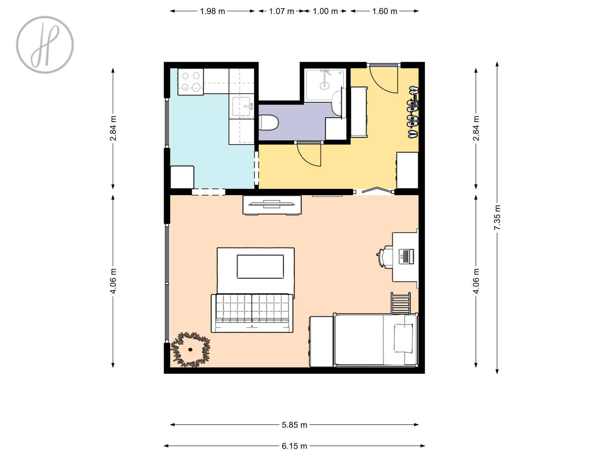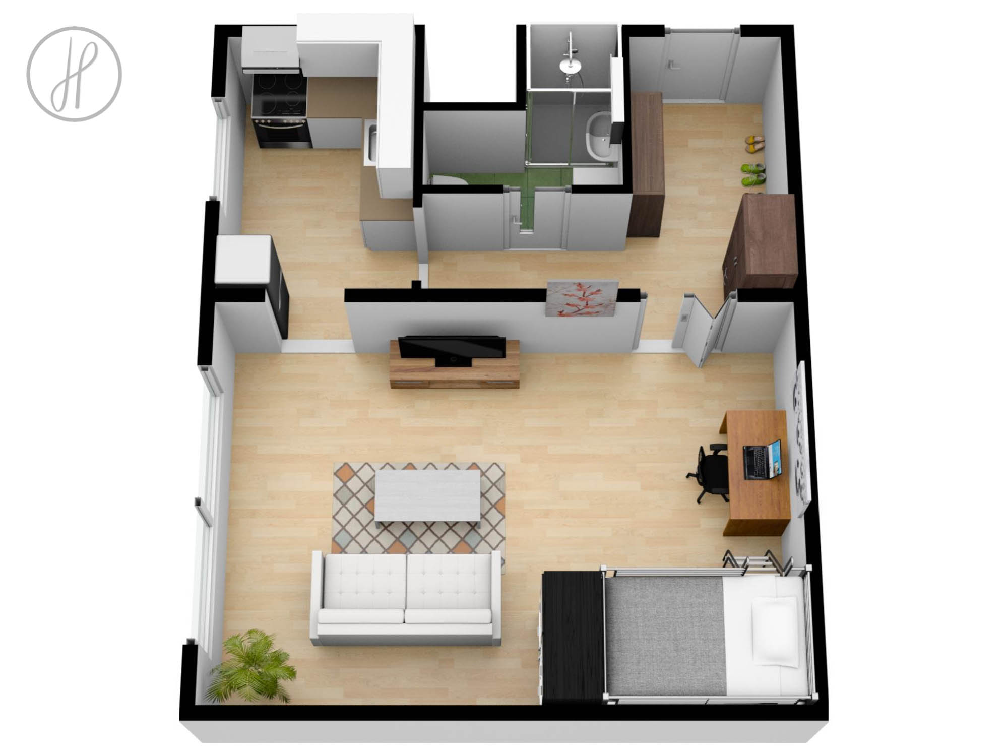 - Dispozice: Prostorná vstupní chodba, koupelna s WC, obývací pokoj spojený s ložnicí a kuchyně.